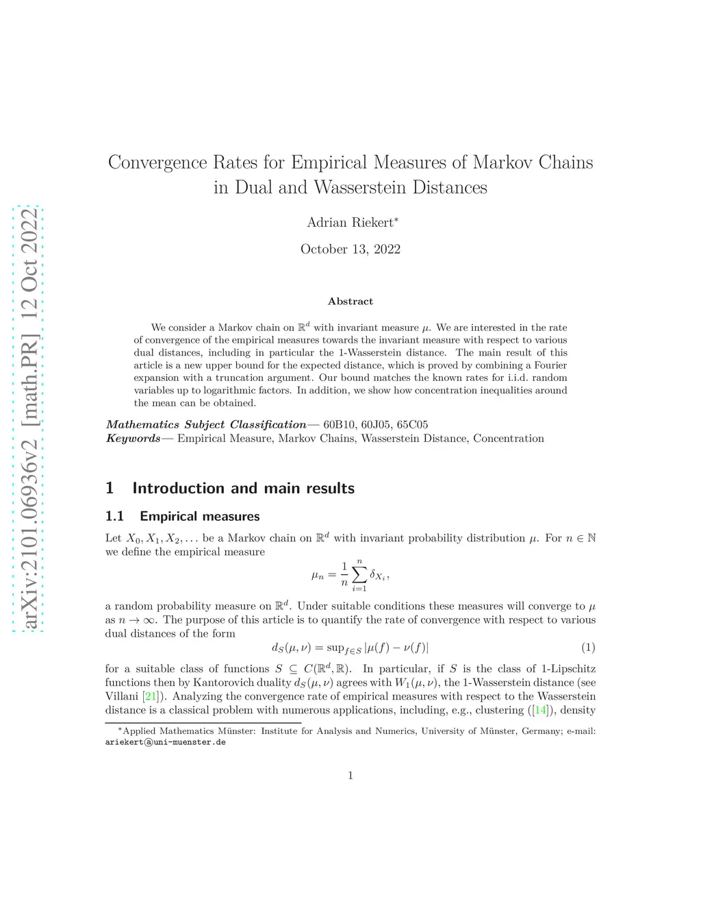 We consider a Markov chain on with invariant measure . We are interested in the rate of convergence of the empirical measures towards the invariant measure with respect to various dual distances, including in particular the -Wasserstein distance. The main result of this article is a new upper bound for the expected distance, which is proved by combining a Fourier expansion with a truncation argument. Our bound matches the known rates for i.i.d. random variables up to logarithmic factors. In addition, we show how concentration inequalities around the mean can be obtained.