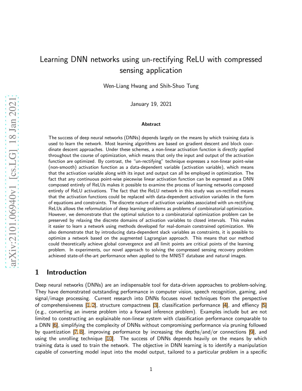 The un-rectifying technique expresses a non-linear point-wise activation function as a data-dependent variable, which means that the activation variable along with its input and output can all be employed in optimization. The ReLU network in this study was un-rectified means that the activation functions could be replaced with data-dependent activation variables in the form of equations and constraints. The discrete nature of activation variables associated with un-rectifying ReLUs allows the reformulation of deep learning problems as problems of combinatorial optimization. However, we demonstrate that the optimal solution to a combinatorial optimization problem can be preserved by relaxing the discrete domains of activation variables to closed intervals. This makes it easier to learn a network using methods developed for real-domain constrained optimization. We also demonstrate that by introducing data-dependent slack variables as constraints, it is possible to optimize a network based on the augmented Lagrangian approach. This means that our method could theoretically achieve global convergence and all limit points are critical points of the learning problem. In experiments, our novel approach to solving the compressed sensing recovery problem achieved state-of-the-art performance when applied to the MNIST database and natural images.
