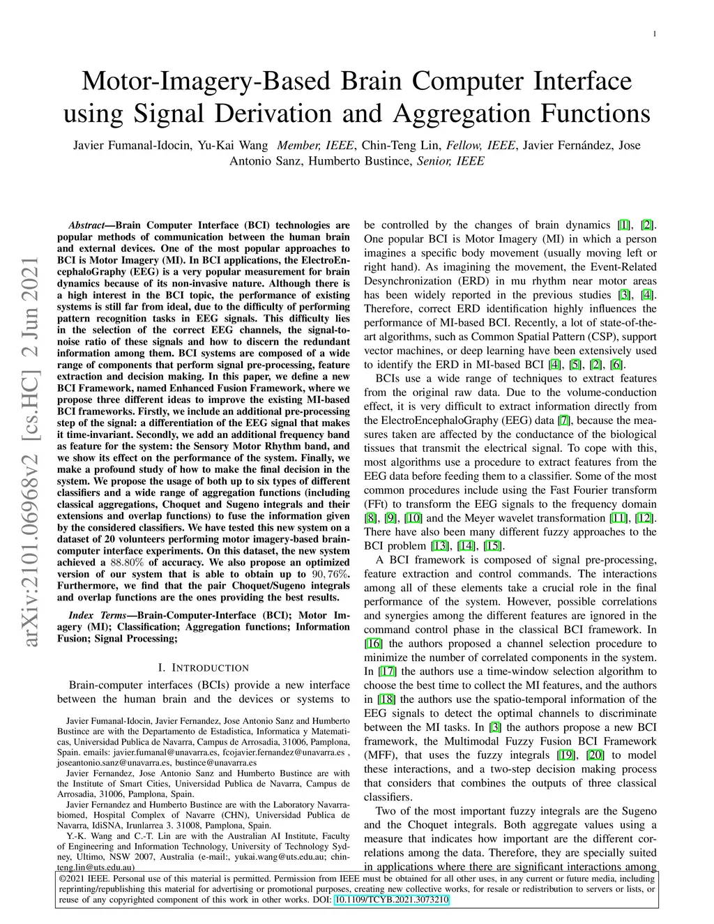 Brain Computer Interface technologies are popular methods of communication between the human brain and external devices. One of the most popular approaches to BCI is Motor Imagery. In BCI applications, the ElectroEncephaloGraphy is a very popular measurement for brain dynamics because of its non-invasive nature. Although there is a high interest in the BCI topic, the performance of existing systems is still far from ideal, due to the difficulty of performing pattern recognition tasks in EEG signals. BCI systems are composed of a wide range of components that perform signal pre-processing, feature extraction and decision making. In this paper, we define a BCI Framework, named Enhanced Fusion Framework, where we propose three different ideas to improve the existing MI-based BCI frameworks. Firstly, we include aan additional pre-processing step of the signal: a differentiation of the EEG signal that makes it time-invariant. Secondly, we add an additional frequency band as feature for the system and we show its effect on the performance of the system. Finally, we make a profound study of how to make the final decision in the system. We propose the usage of both up to six types of different classifiers and a wide range of aggregation functions (including classical aggregations, Choquet and Sugeno integrals and their extensions and overlap functions) to fuse the information given by the considered classifiers. We have tested this new system on a dataset of 20 volunteers performing motor imagery-based brain-computer interface experiments. On this dataset, the new system achieved a 88.80% of accuracy. We also propose an optimized version of our system that is able to obtain up to 90,76%. Furthermore, we find that the pair Choquet/Sugeno integrals and overlap functions are the ones providing the best results.