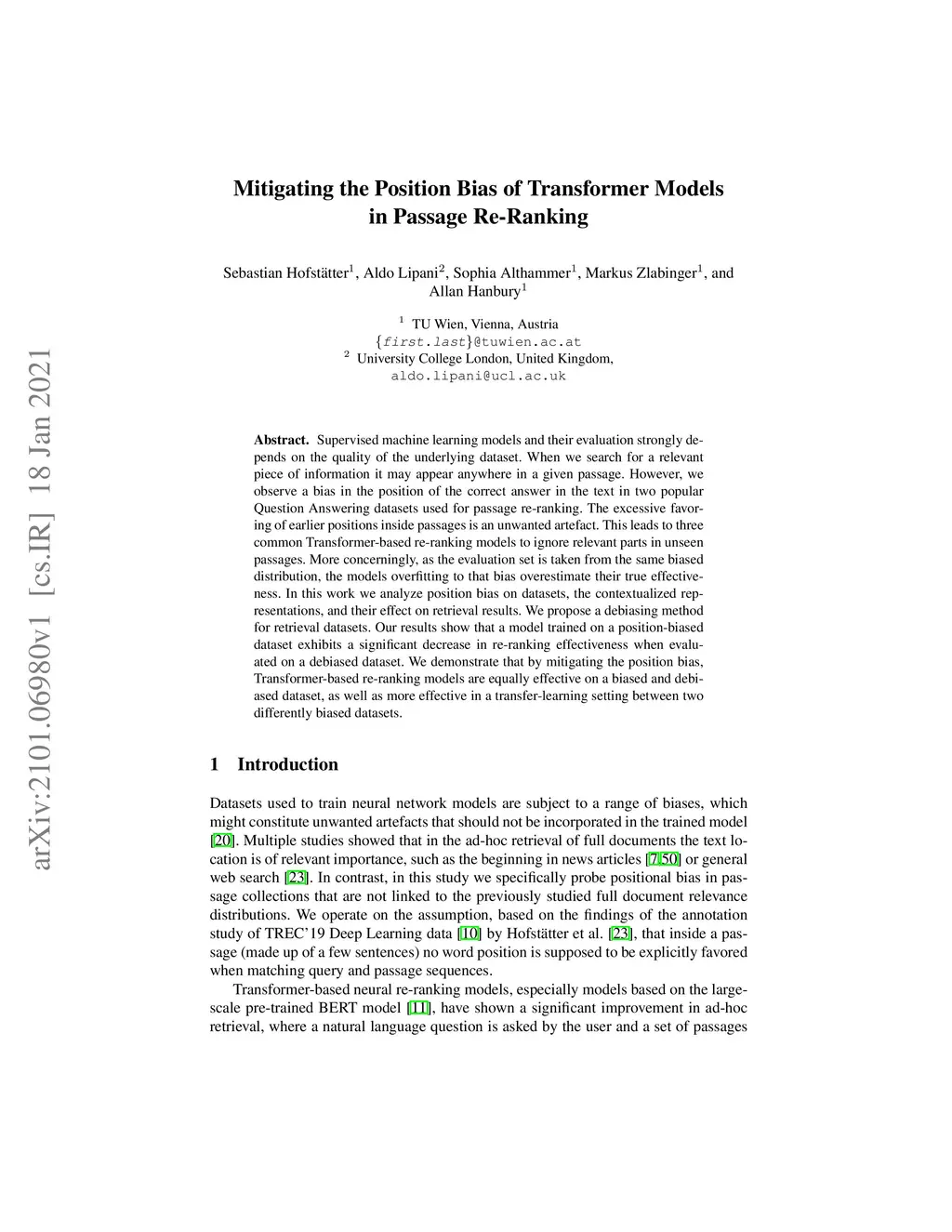 Supervised machine learning models and their evaluation strongly depends on the quality of the underlying dataset. When we search for a relevant piece of information it may appear anywhere in a given passage. However, we observe a bias in the position of the correct answer in the text in two popular Question Answering datasets used for passage re-ranking. The excessive favoring of earlier positions inside passages is an unwanted artefact. This leads to three common Transformer-based re-ranking models to ignore relevant parts in unseen passages. More concerningly, as the evaluation set is taken from the same biased distribution, the models overfitting to that bias overestimate their true effectiveness. In this work we analyze position bias on datasets, the contextualized representations, and their effect on retrieval results. We propose a debiasing method for retrieval datasets. Our results show that a model trained on a position-biased dataset exhibits a significant decrease in re-ranking effectiveness when evaluated on a debiased dataset. We demonstrate that by mitigating the position bias, Transformer-based re-ranking models are equally effective on a biased and debiased dataset, as well as more effective in a transfer-learning setting between two differently biased datasets.