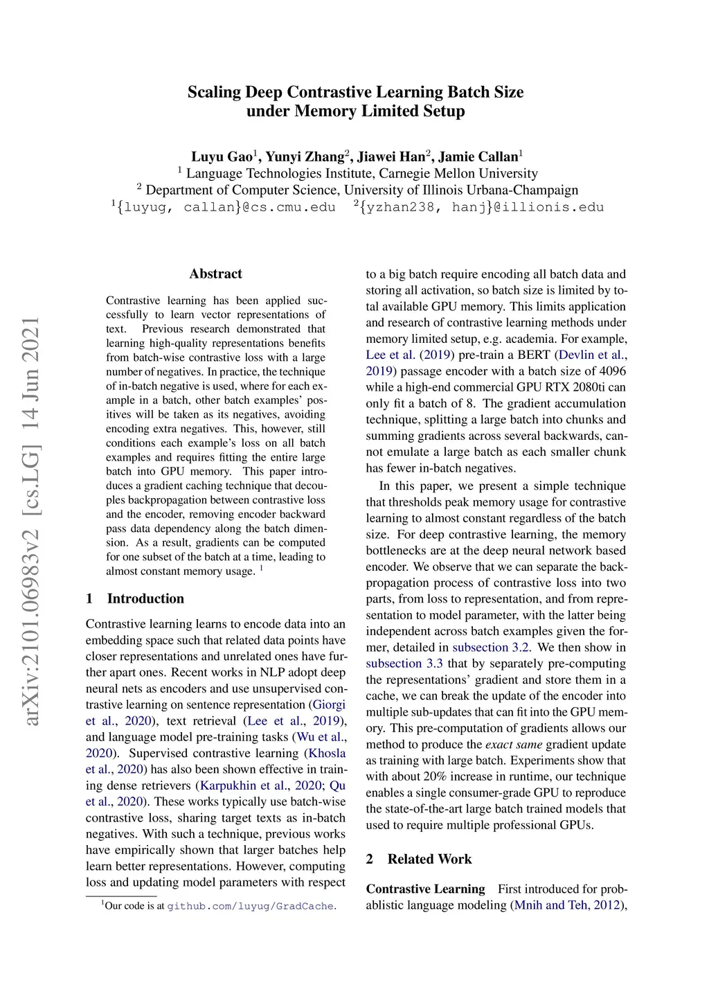 Contrastive learning has been applied successfully to learn vector representations of text. Previous research demonstrated that learning high-quality representations benefits from batch-wise contrastive loss with a large number of negatives. In practice, the technique of in-batch negative is used, where for each example in a batch, other batch examples' positives will be taken as its negatives, avoiding encoding extra negatives. This, however, still conditions each example's loss on all batch examples and requires fitting the entire large batch into GPU memory. This paper introduces a gradient caching technique that decouples backpropagation between contrastive loss and the encoder, removing encoder backward pass data dependency along the batch dimension. As a result, gradients can be computed for one subset of the batch at a time, leading to almost constant memory usage.