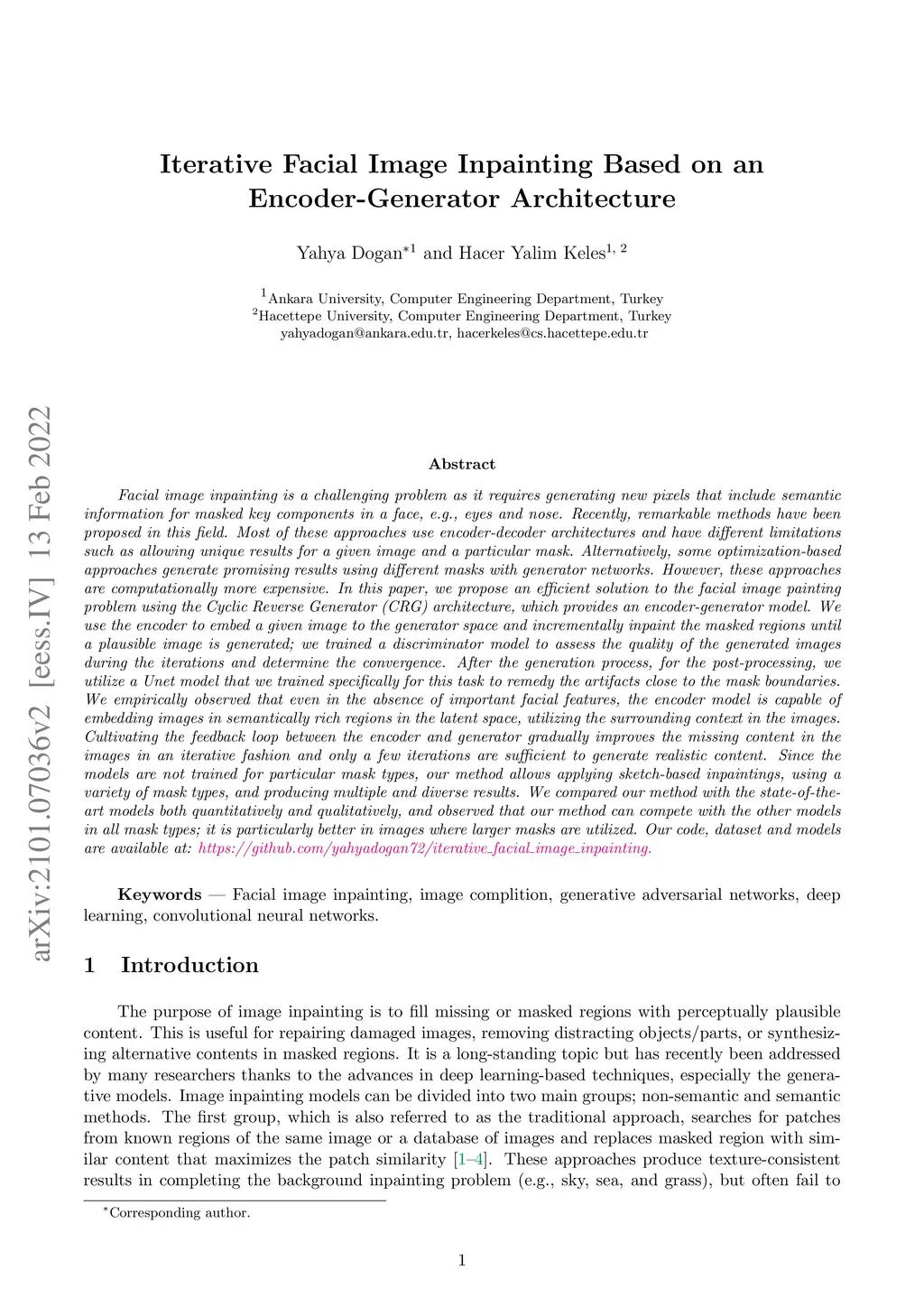 Iterative Facial Image Inpainting Based on an Encoder-Generator