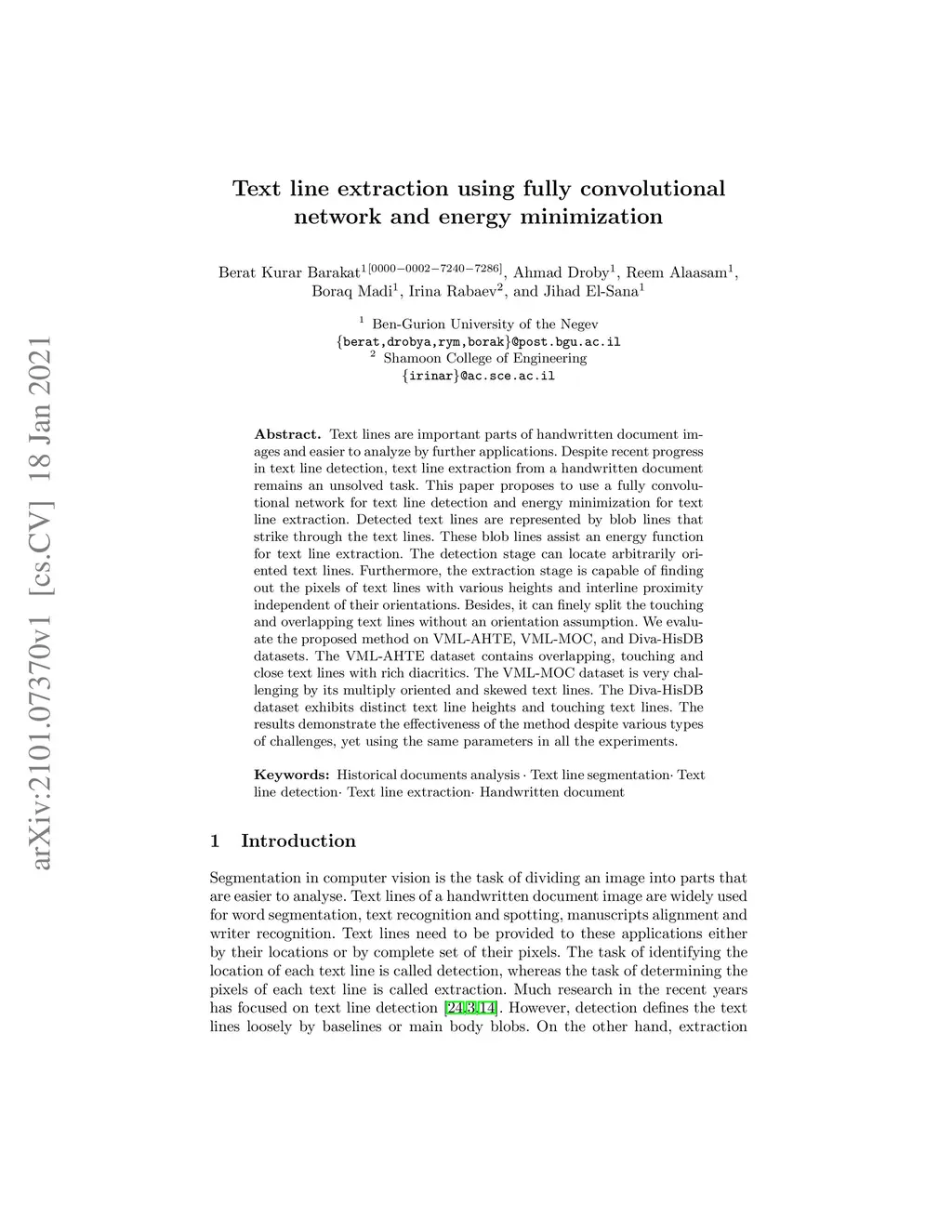 Text line extraction using fully convolutional network and energy