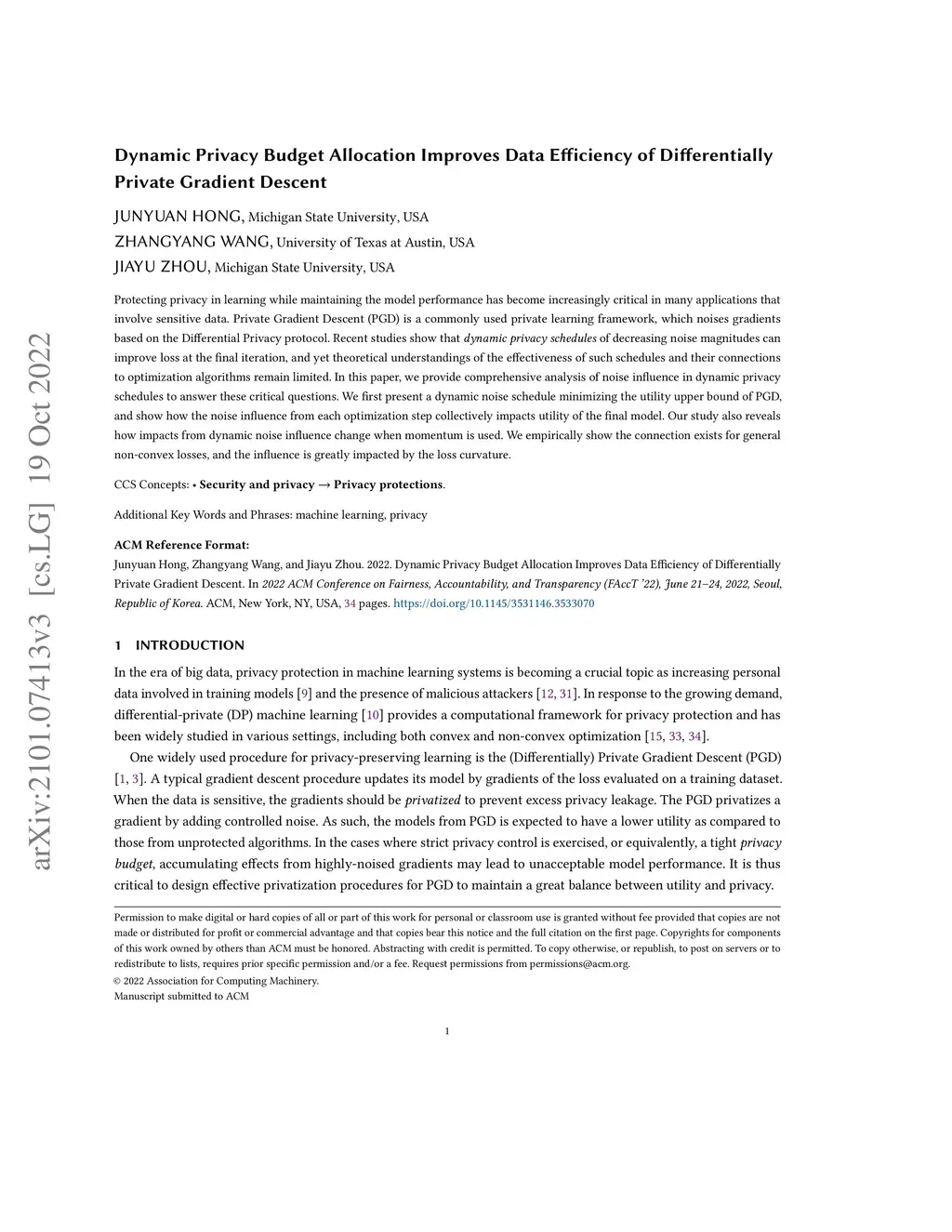 Protecting privacy in learning while maintaining the model performance has become increasingly critical in many applications that involve sensitive data. A popular private learning framework is differentially private learning composed of many privatized gradient iterations by noising and clipping. Under the privacy constraint, it has been shown that the dynamic policies could improve the final iterate loss, namely the quality of published models. In this talk, we will introduce these dynamic techniques for learning rate, batch size, noise magnitude and gradient clipping. Also, we discuss how the dynamic policy could change the convergence bounds which further provides insight of the impact of dynamic methods.