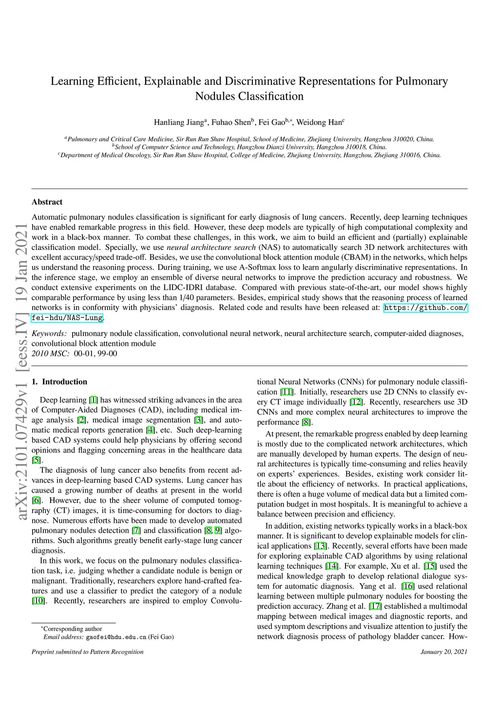 Automatic pulmonary nodules classification is significant for early diagnosis of lung cancers. Recently, deep learning techniques have enabled remarkable progress in this field. However, these deep models are typically of high computational complexity and work in a black-box manner. To combat these challenges, in this work, we aim to build an efficient and (partially) explainable classification model. Specially, we use \emph{neural architecture search} (NAS) to automatically search 3D network architectures with excellent accuracy/speed trade-off. Besides, we use the convolutional block attention module (CBAM) in the networks, which helps us understand the reasoning process. During training, we use A-Softmax loss to learn angularly discriminative representations. In the inference stage, we employ an ensemble of diverse neural networks to improve the prediction accuracy and robustness. We conduct extensive experiments on the LIDC-IDRI database. Compared with previous state-of-the-art, our model shows highly comparable performance by using less than 1/40 parameters. Besides, empirical study shows that the reasoning process of learned networks is in conformity with physicians' diagnosis. Related code and results have been released at: https://github.com/fei-hdu/NAS-Lung.