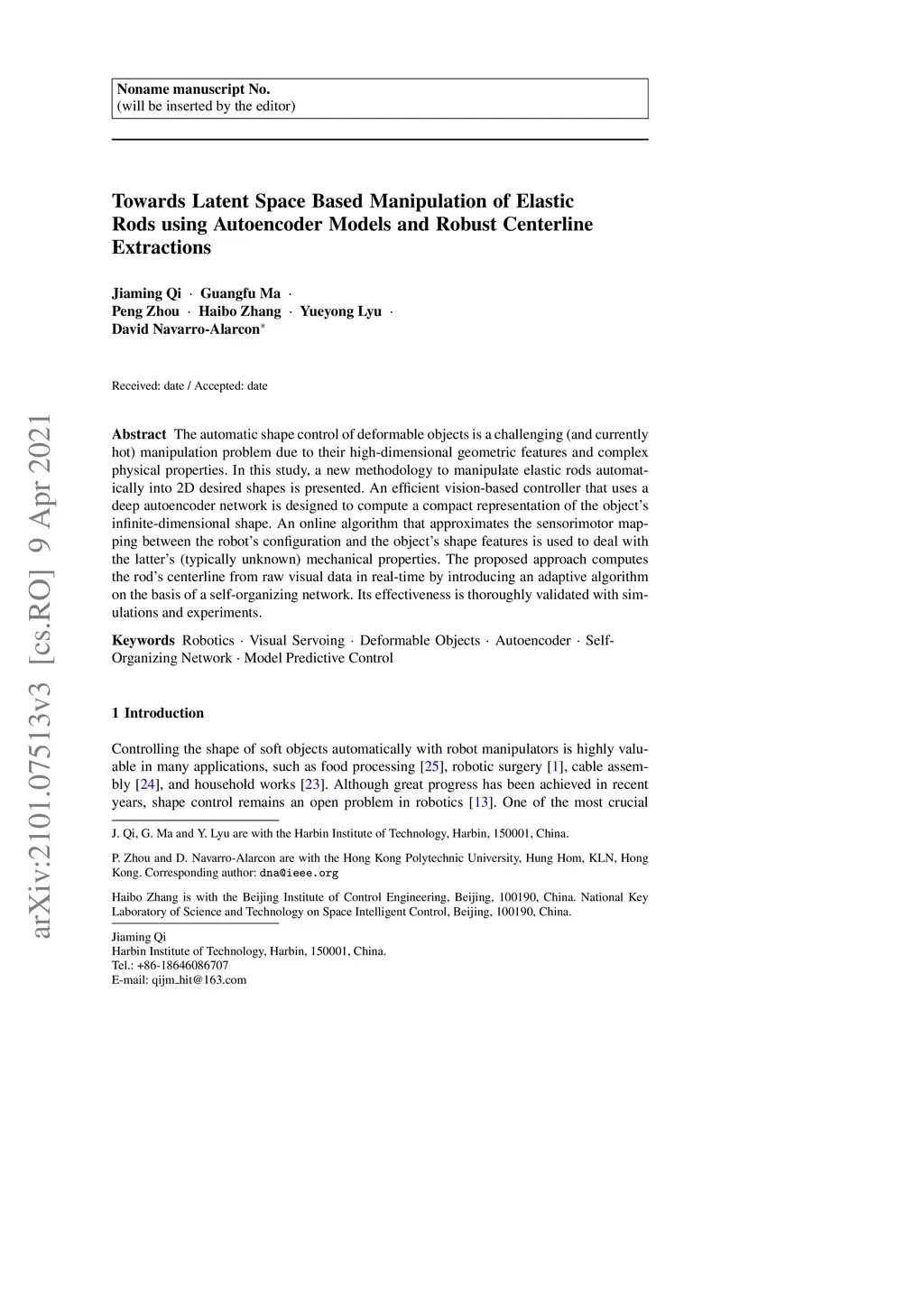 The automatic shape control of deformable objects is a challenging (and currently hot) manipulation problem due to their high-dimensional geometric features and complex physical properties. In this study, a new methodology to manipulate elastic rods automatically into 2D desired shapes is presented. An efficient vision-based controller that uses a deep autoencoder network is designed to compute a compact representation of the object's infinite-dimensional shape. An online algorithm that approximates the sensorimotor mapping between the robot's configuration and the object's shape features is used to deal with the latter's (typically unknown) mechanical properties. The proposed approach computes the rod's centerline from raw visual data in real-time by introducing an adaptive algorithm on the basis of a self-organizing network. Its effectiveness is thoroughly validated with simulations and experiments.