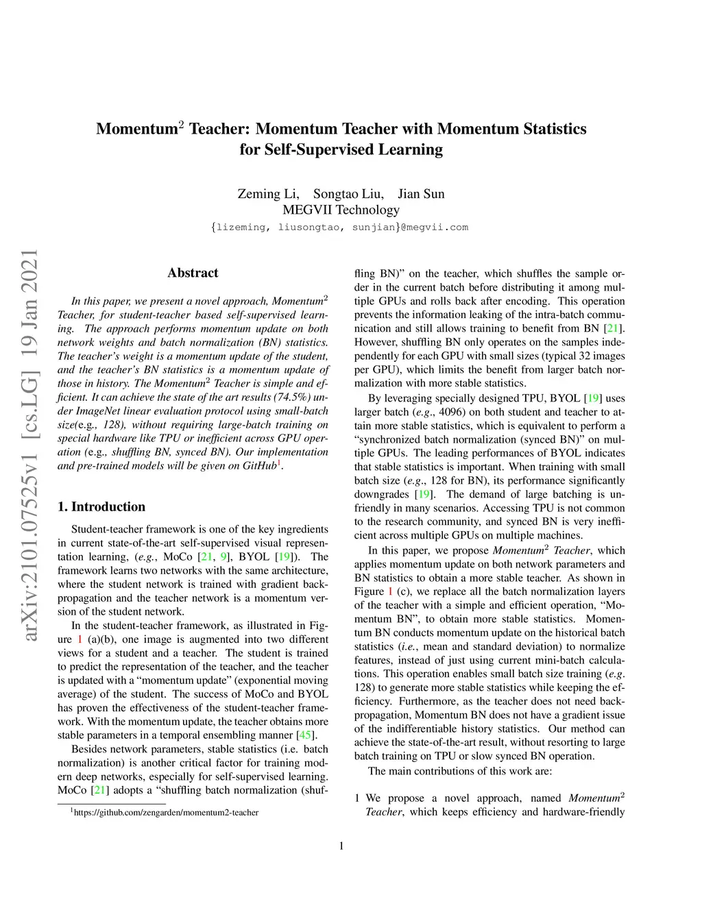 In this paper, we present a novel approach, Momentum Teacher, for student-teacher based self-supervised learning. The approach performs momentum update on both network weights and batch normalization (BN) statistics. The teacher's weight is a momentum update of the student, and the teacher's BN statistics is a momentum update of those in history. The Momentum Teacher is simple and efficient. It can achieve the state of the art results (74.5\%) under ImageNet linear evaluation protocol using small-batch size(\eg, 128), without requiring large-batch training on special hardware like TPU or inefficient across GPU operation (\eg, shuffling BN, synced BN). Our implementation and pre-trained models will be given on GitHub\footnote{https://github.com/zengarden/momentum2-teacher}.