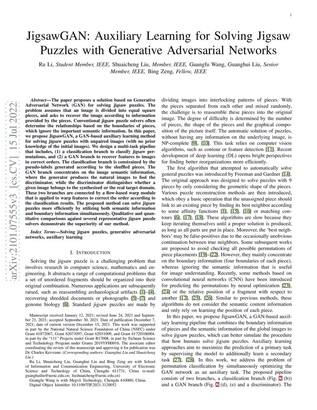 JigsawGAN: Self-supervised Learning for Solving Jigsaw Puzzles with