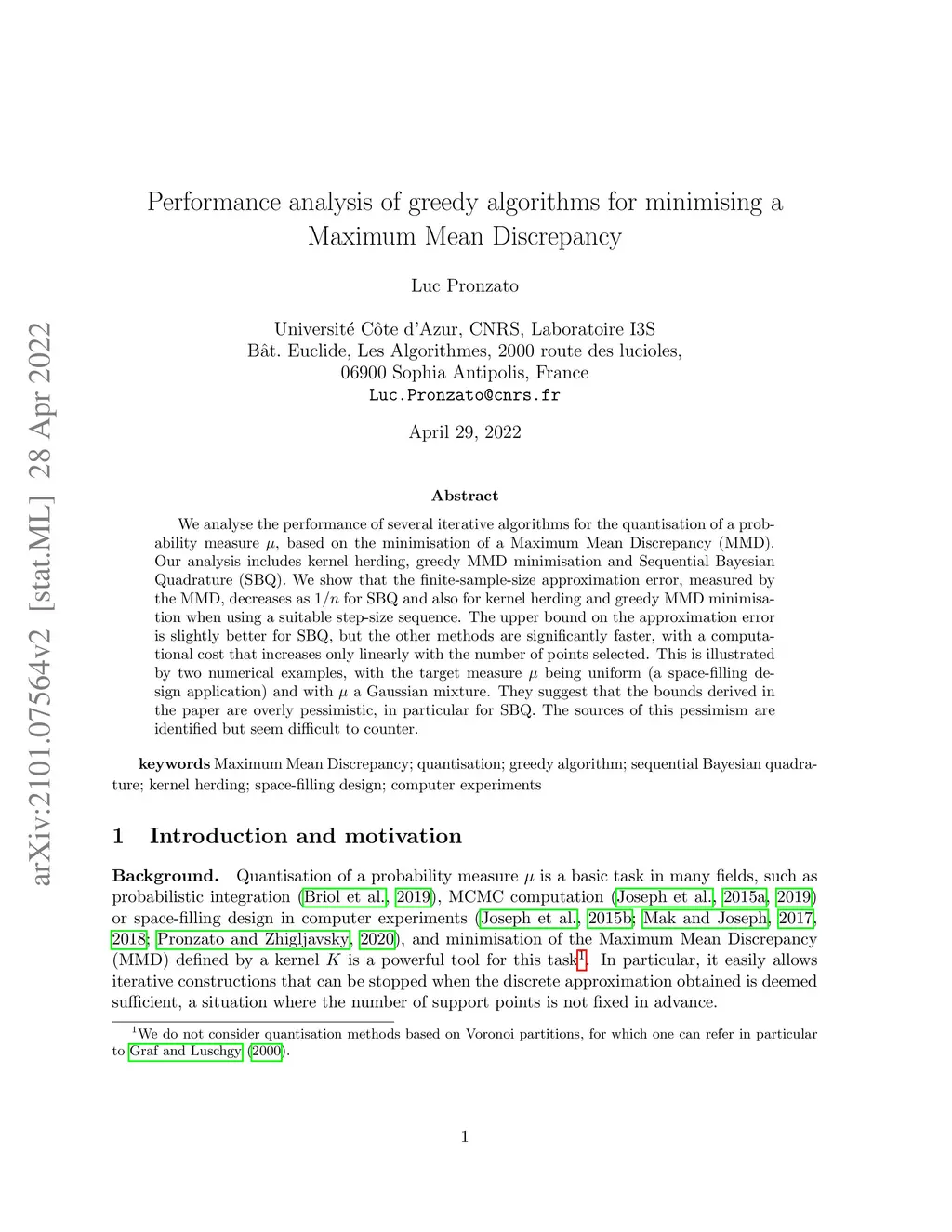 We analyse the performance of several iterative algorithms for the quantisation of a probability measure , based on the minimisation of a Maximum Mean Discrepancy (MMD). Our analysis includes kernel herding, greedy MMD minimisation and Sequential Bayesian Quadrature (SBQ). We show that the finite-sample-size approximation error, measured by the MMD, decreases as for SBQ and also for kernel herding and greedy MMD minimisation when using a suitable step-size sequence. The upper bound on the approximation error is slightly better for SBQ, but the other methods are significantly faster, with a computational cost that increases only linearly with the number of points selected. This is illustrated by two numerical examples, with the target measure being uniform (a space-filling design application) and with a Gaussian mixture. They suggest that the bounds derived in the paper are overly pessimistic, in particular for SBQ. The sources of this pessimism are identified but seem difficult to counter.