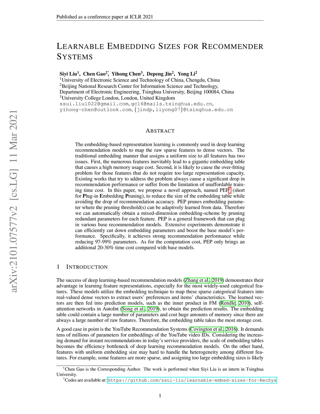 The embedding-based representation learning is commonly used in deep learning recommendation models to map the raw sparse features to dense vectors. The traditional embedding manner that assigns a uniform size to all features has two issues. First, the numerous features inevitably lead to a gigantic embedding table that causes a high memory usage cost. Second, it is likely to cause the over-fitting problem for those features that do not require too large representation capacity. Existing works that try to address the problem always cause a significant drop in recommendation performance or suffers from the limitation of unaffordable training time cost. In this paper, we proposed a novel approach, named PEP (short for Plug-in Embedding Pruning), to reduce the size of the embedding table while avoiding the drop of recommendation accuracy. PEP prunes embedding parameter where the pruning threshold(s) can be adaptively learned from data. Therefore we can automatically obtain a mixed-dimension embedding-scheme by pruning redundant parameters for each feature. PEP is a general framework that can plug in various base recommendation models. Extensive experiments demonstrate it can efficiently cut down embedding parameters and boost the base model's performance. Specifically, it achieves strong recommendation performance while reducing 97-99% parameters. As for the computation cost, PEP only brings an additional 20-30% time cost compared with base models. Codes are available at https://github.com/ssui-liu/learnable-embed-sizes-for-RecSys.