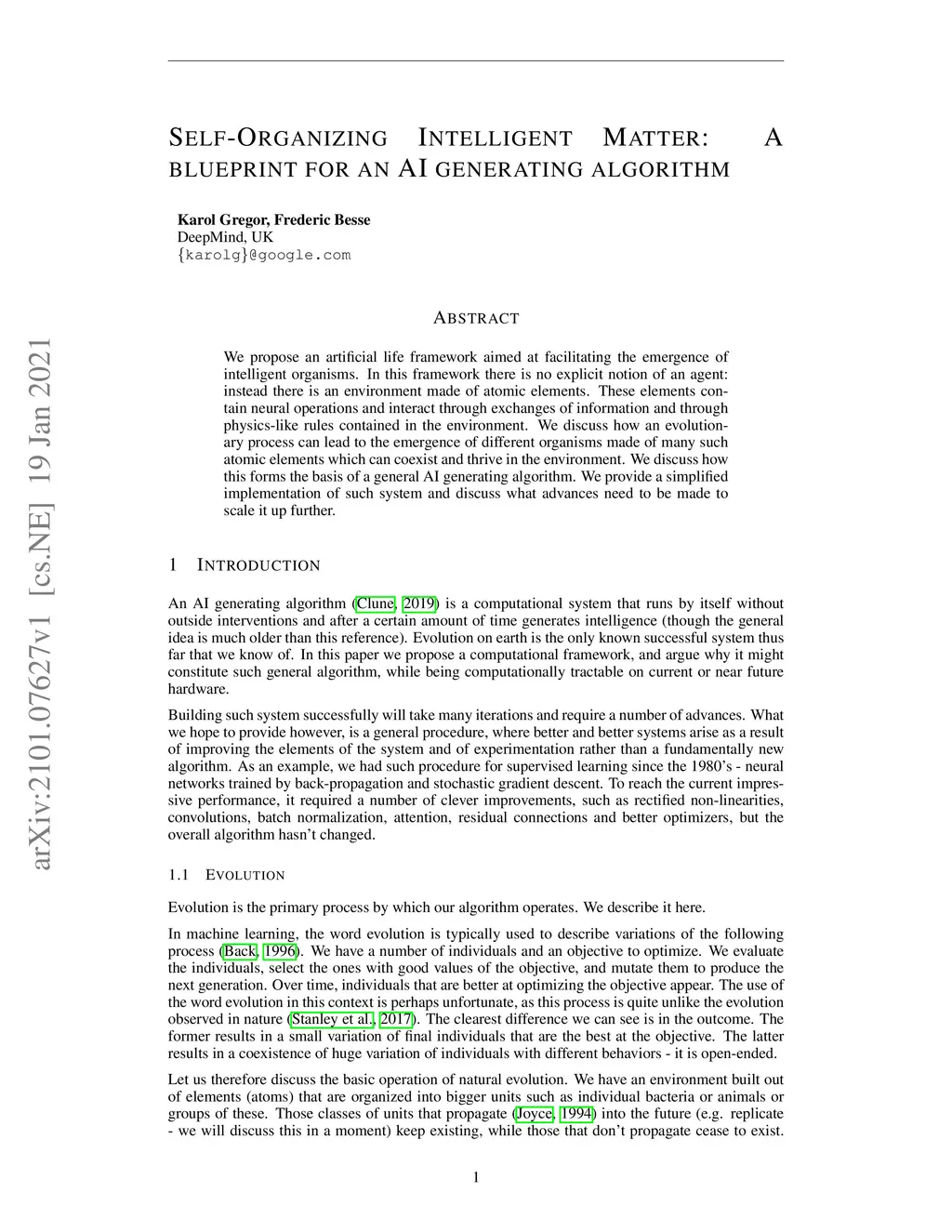 Self-Organizing Intelligent Matter: A blueprint for an AI generating