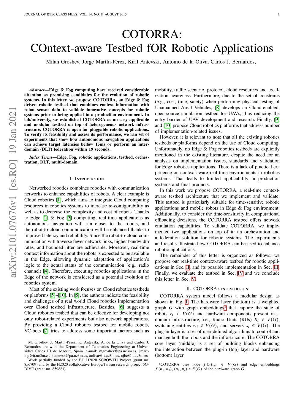 Edge & Fog computing have received considerable attention as promising candidates for the evolution of robotic systems. In this letter, we propose COTORRA, an Edge & Fog driven robotic testbed that combines context information with robot sensor data to validate innovative concepts for robotic systems prior to being applied in a production environment. In lab/university, we established COTORRA as an easy applicable and modular testbed on top of heterogeneous network infrastructure. COTORRA is open for pluggable robotic applications. To verify its feasibility and assess its performance, we ran set of experiments that show how autonomous navigation applications can achieve target latencies bellow 15ms or perform an inter-domain (DLT) federation within 19 seconds.