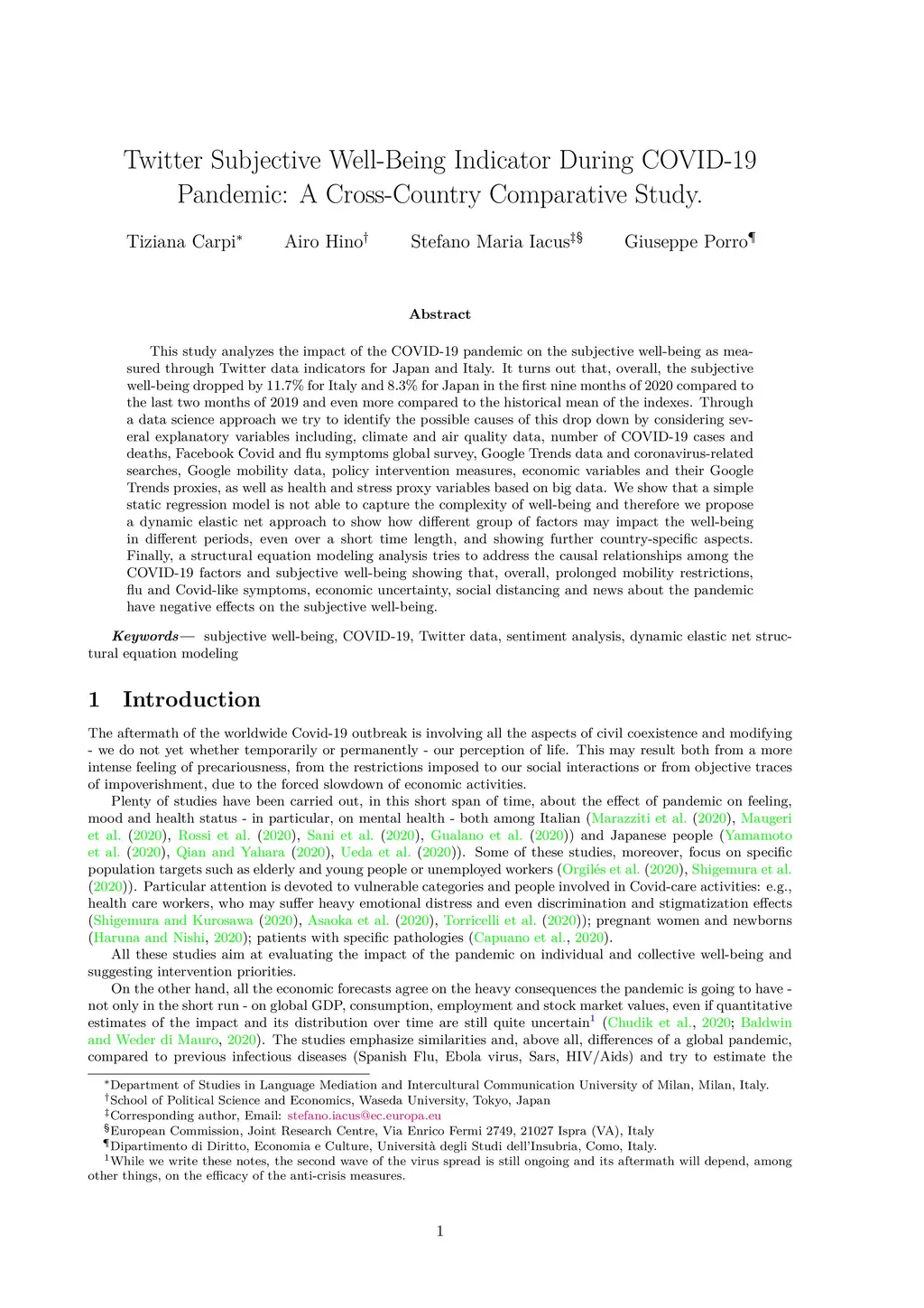 This study analyzes the impact of the COVID-19 pandemic on the subjective well-being as measured through Twitter data indicators for Japan and Italy. It turns out that, overall, the subjective well-being dropped by 11.7% for Italy and 8.3% for Japan in the first nine months of 2020 compared to the last two months of 2019 and even more compared to the historical mean of the indexes. Through a data science approach we try to identify the possible causes of this drop down by considering several explanatory variables including, climate and air quality data, number of COVID-19 cases and deaths, Facebook Covid and flu symptoms global survey, Google Trends data and coronavirus-related searches, Google mobility data, policy intervention measures, economic variables and their Google Trends proxies, as well as health and stress proxy variables based on big data. We show that a simple static regression model is not able to capture the complexity of well-being and therefore we propose a dynamic elastic net approach to show how different group of factors may impact the well-being in different periods, even over a short time length, and showing further country-specific aspects. Finally, a structural equation modeling analysis tries to address the causal relationships among the COVID-19 factors and subjective well-being showing that, overall, prolonged mobility restrictions,flu and Covid-like symptoms, economic uncertainty, social distancing and news about the pandemic have negative effects on the subjective well-being.
