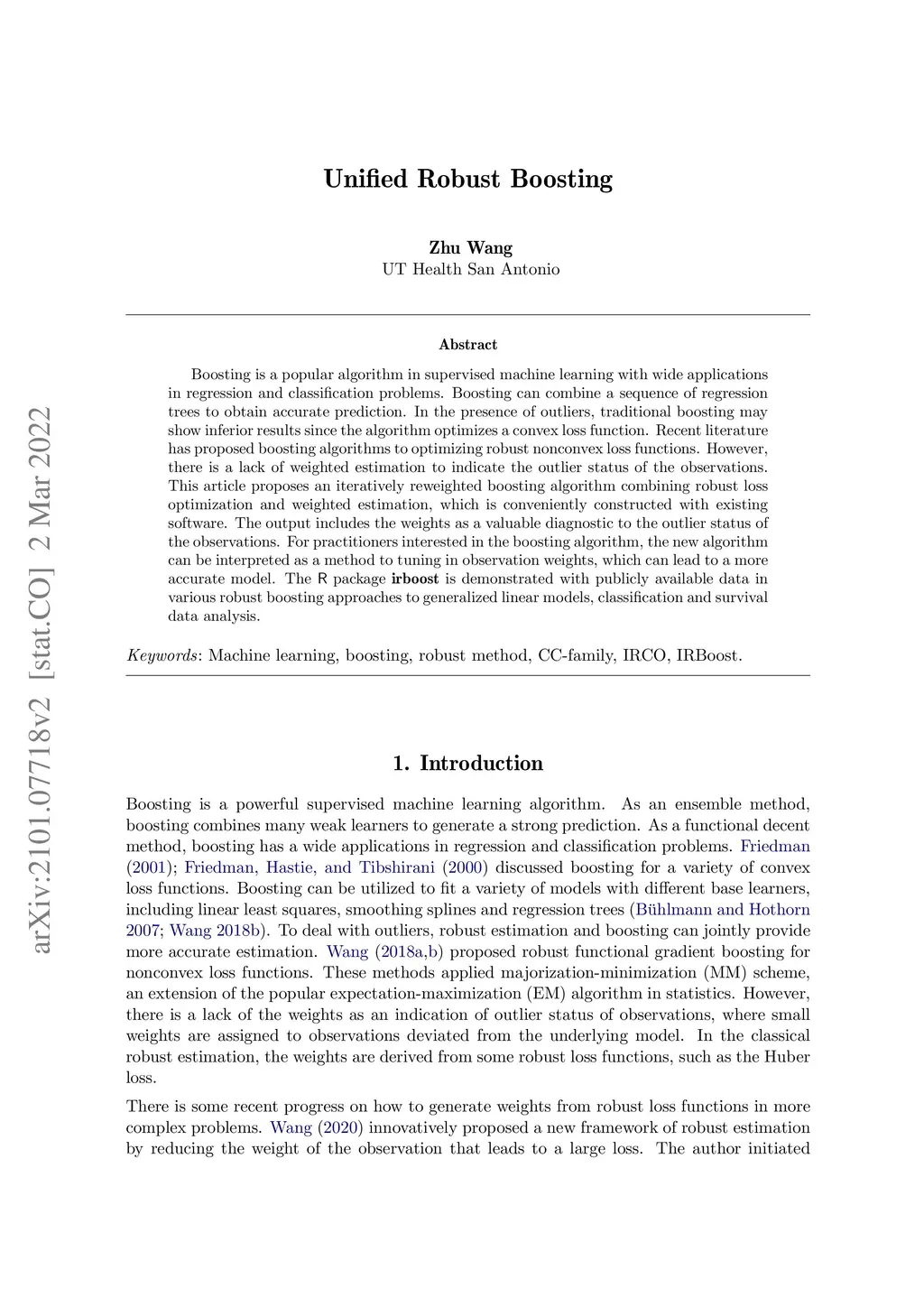 Boosting is a popular algorithm in supervised machine learning with wide applications in regression and classification problems. Boosting can combine a sequence of regression trees to obtain accurate prediction. In the presence of outliers, traditional boosting may show inferior results since the algorithm optimizes a convex loss function. Recent literature has proposed boosting algorithms to optimizing robust nonconvex loss functions. However, there is a lack of weighted estimation to indicate the outlier status of the observations. This article proposes an iteratively reweighted boosting algorithm combining robust loss optimization and weighted estimation, which is conveniently constructed with existing software. The output includes the weights as a valuable diagnostic to the outlier status of the observations. For practitioners interested in the boosting algorithm, the new algorithm can be interpreted as a method to tuning in observation weights, which can lead to a more accurate model. The R package irboost is demonstrated with publicly available data in various robust boosting approaches to generalized linear models, classification and survival data analysis.