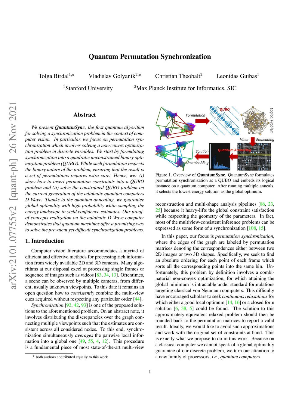We present QuantumSync, the first quantum algorithm for solving a synchronization problem in the context of computer vision. In particular, we focus on permutation synchronization which involves solving a non-convex optimization problem in discrete variables. We start by formulating synchronization into a quadratic unconstrained binary optimization problem (QUBO). While such formulation respects the binary nature of the problem, ensuring that the result is a set of permutations requires extra care. Hence, we: (I) show how to insert permutation constraints into a QUBO problem and (ii) solve the constrained QUBO problem on the current generation of the adiabatic quantum computers D-Wave. Thanks to the quantum annealing, we guarantee global optimality with high probability while sampling the energy landscape to yield confidence estimates. Our proof-of-concepts realization on the adiabatic D-Wave computer demonstrates that quantum machines offer a promising way to solve the prevalent yet difficult synchronization problems.