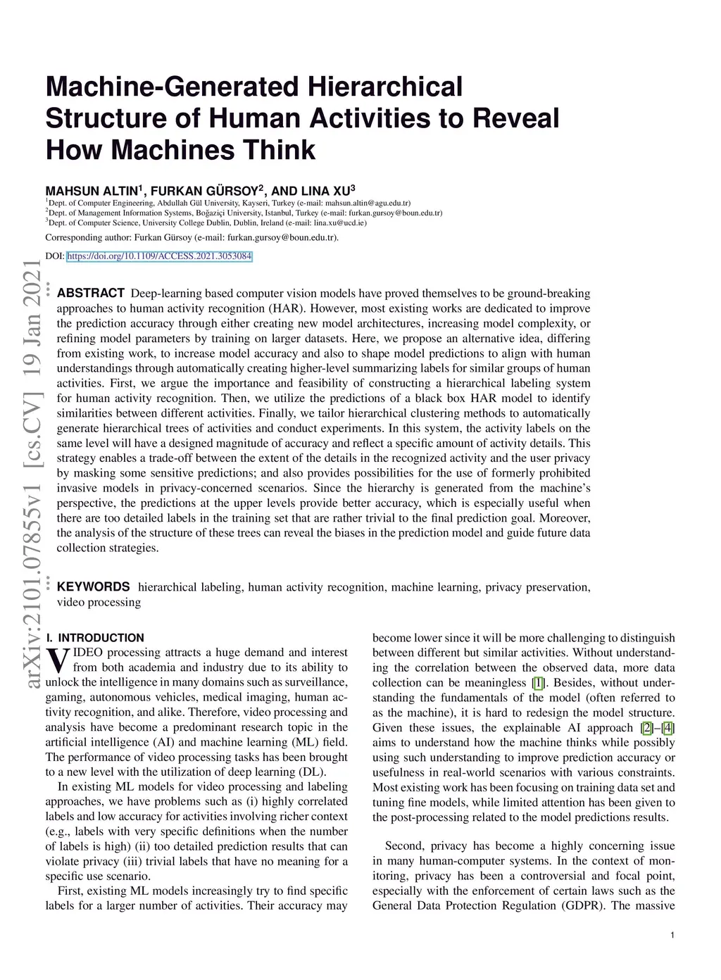 Deep-learning based computer vision models have proved themselves to be ground-breaking approaches to human activity recognition (HAR). However, most existing works are dedicated to improve the prediction accuracy through either creating new model architectures, increasing model complexity, or refining model parameters by training on larger datasets. Here, we propose an alternative idea, differing from existing work, to increase model accuracy and also to shape model predictions to align with human understandings through automatically creating higher-level summarizing labels for similar groups of human activities. First, we argue the importance and feasibility of constructing a hierarchical labeling system for human activity recognition. Then, we utilize the predictions of a black box HAR model to identify similarities between different activities. Finally, we tailor hierarchical clustering methods to automatically generate hierarchical trees of activities and conduct experiments. In this system, the activity labels on the same level will have a designed magnitude of accuracy and reflect a specific amount of activity details. This strategy enables a trade-off between the extent of the details in the recognized activity and the user privacy by masking some sensitive predictions; and also provides possibilities for the use of formerly prohibited invasive models in privacy-concerned scenarios. Since the hierarchy is generated from the machine's perspective, the predictions at the upper levels provide better accuracy, which is especially useful when there are too detailed labels in the training set that are rather trivial to the final prediction goal. Moreover, the analysis of the structure of these trees can reveal the biases in the prediction model and guide future data collection strategies.