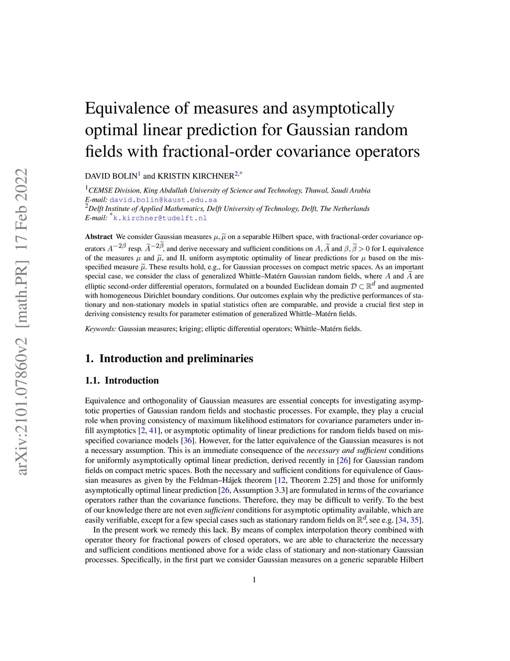 We consider Gaussian measures on a separable Hilbert space, with fractional-order covariance operators resp. , and derive necessary and sufficient conditions on and for I. equivalence of the measures and , and II. uniform asymptotic optimality of linear predictions for based on the misspecified measure . These results hold, e.g., for Gaussian processes on compact metric spaces. As an important special case, we consider the class of generalized Whittle-Mat\érn Gaussian random fields, where and are elliptic second-order differential operators, formulated on a bounded Euclidean domain and augmented with homogeneous Dirichlet boundary conditions. Our outcomes explain why the predictive performances of stationary and non-stationary models in spatial statistics often are comparable, and provide a crucial first step in deriving consistency results for parameter estimation of generalized Whittle-Mat\érn fields.