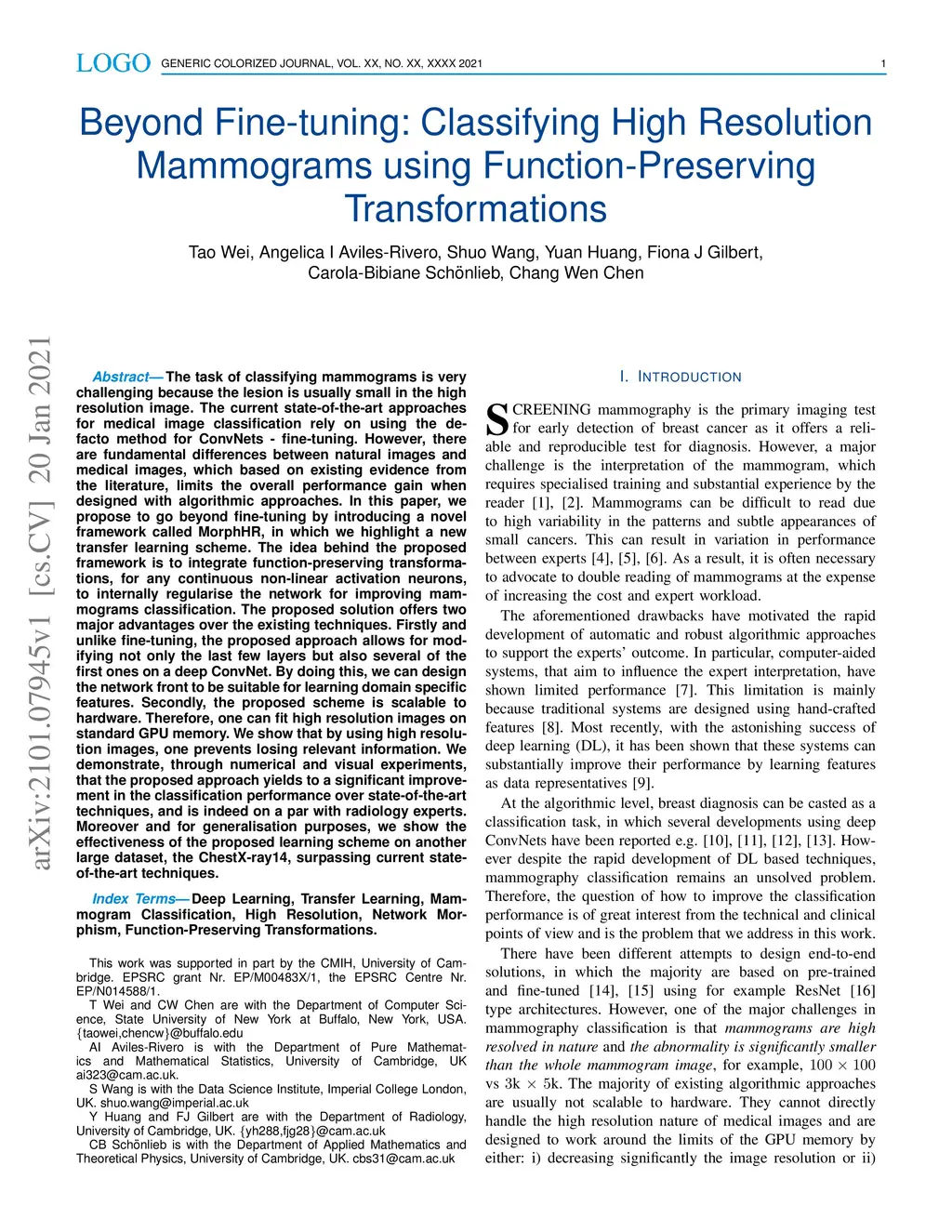 The task of classifying mammograms is very challenging because the lesion is usually small in the high resolution image. The current state-of-the-art approaches for medical image classification rely on using the de-facto method for ConvNets - fine-tuning. However, there are fundamental differences between natural images and medical images, which based on existing evidence from the literature, limits the overall performance gain when designed with algorithmic approaches. In this paper, we propose to go beyond fine-tuning by introducing a novel framework called MorphHR, in which we highlight a new transfer learning scheme. The idea behind the proposed framework is to integrate function-preserving transformations, for any continuous non-linear activation neurons, to internally regularise the network for improving mammograms classification. The proposed solution offers two major advantages over the existing techniques. Firstly and unlike fine-tuning, the proposed approach allows for modifying not only the last few layers but also several of the first ones on a deep ConvNet. By doing this, we can design the network front to be suitable for learning domain specific features. Secondly, the proposed scheme is scalable to hardware. Therefore, one can fit high resolution images on standard GPU memory. We show that by using high resolution images, one prevents losing relevant information. We demonstrate, through numerical and visual experiments, that the proposed approach yields to a significant improvement in the classification performance over state-of-the-art techniques, and is indeed on a par with radiology experts. Moreover and for generalisation purposes, we show the effectiveness of the proposed learning scheme on another large dataset, the ChestX-ray14, surpassing current state-of-the-art techniques.