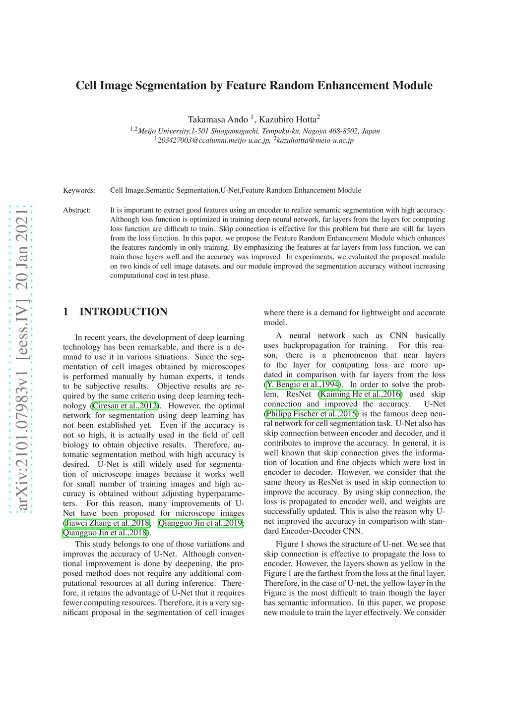 It is important to extract good features using an encoder to realize semantic segmentation with high accuracy. Although loss function is optimized in training deep neural network, far layers from the layers for computing loss function are difficult to train. Skip connection is effective for this problem but there are still far layers from the loss function. In this paper, we propose the Feature Random Enhancement Module which enhances the features randomly in only training. By emphasizing the features at far layers from loss function, we can train those layers well and the accuracy was improved. In experiments, we evaluated the proposed module on two kinds of cell image datasets, and our module improved the segmentation accuracy without increasing computational cost in test phase.