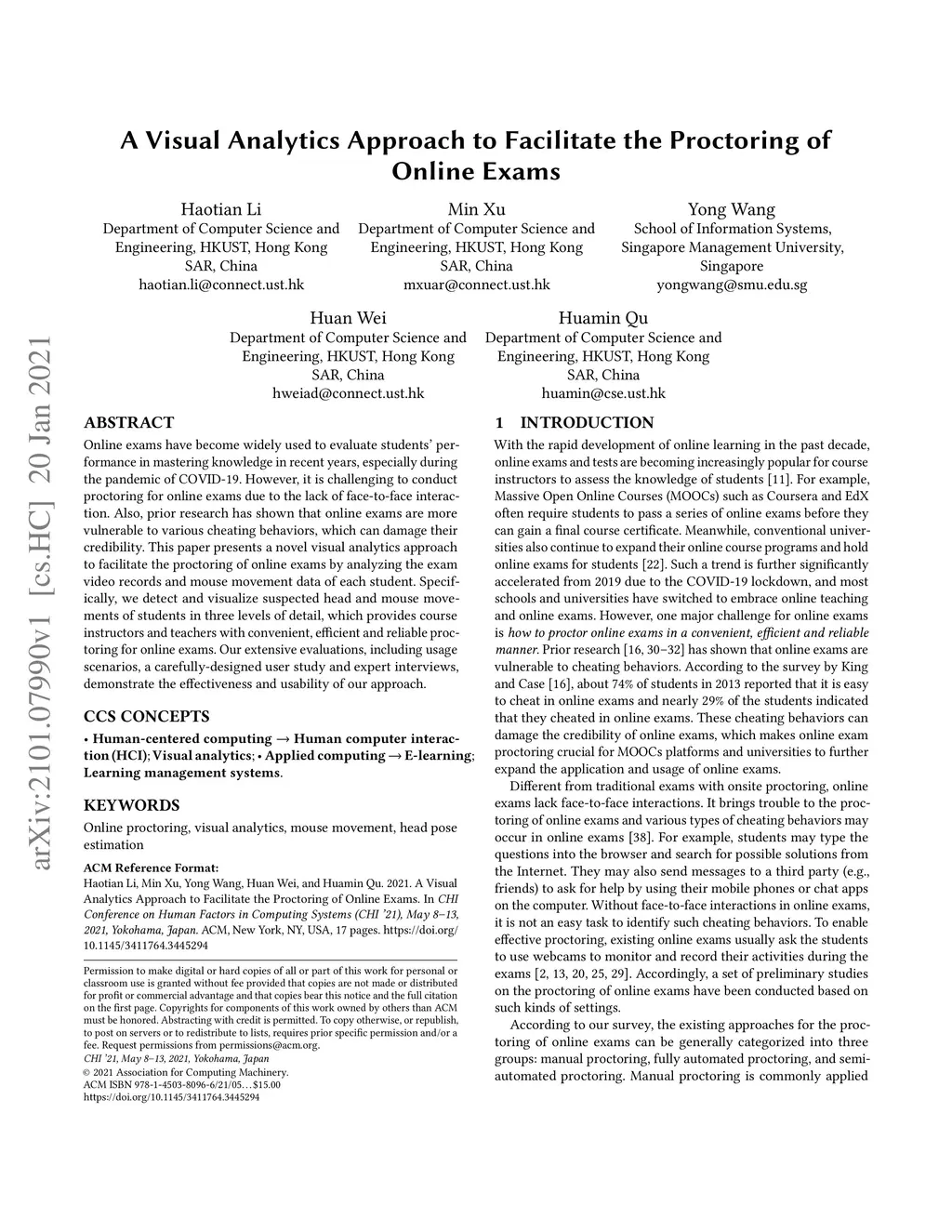 Online exams have become widely used to evaluate students' performance in mastering knowledge in recent years, especially during the pandemic of COVID-19. However, it is challenging to conduct proctoring for online exams due to the lack of face-to-face interaction. Also, prior research has shown that online exams are more vulnerable to various cheating behaviors, which can damage their credibility. This paper presents a novel visual analytics approach to facilitate the proctoring of online exams by analyzing the exam video records and mouse movement data of each student. Specifically, we detect and visualize suspected head and mouse movements of students in three levels of detail, which provides course instructors and teachers with convenient, efficient and reliable proctoring for online exams. Our extensive evaluations, including usage scenarios, a carefully-designed user study and expert interviews, demonstrate the effectiveness and usability of our approach.
