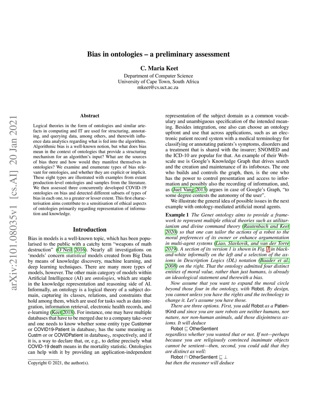 Logical theories in the form of ontologies and similar artefacts in computing and IT are used for structuring, annotating, and querying data, among others, and therewith influence data analytics regarding what is fed into the algorithms. Algorithmic bias is a well-known notion, but what does bias mean in the context of ontologies that provide a structuring mechanism for an algorithm's input? What are the sources of bias there and how would they manifest themselves in ontologies? We examine and enumerate types of bias relevant for ontologies, and whether they are explicit or implicit. These eight types are illustrated with examples from extant production-level ontologies and samples from the literature. We then assessed three concurrently developed COVID-19 ontologies on bias and detected different subsets of types of bias in each one, to a greater or lesser extent. This first characterisation aims contribute to a sensitisation of ethical aspects of ontologies primarily regarding representation of information and knowledge.