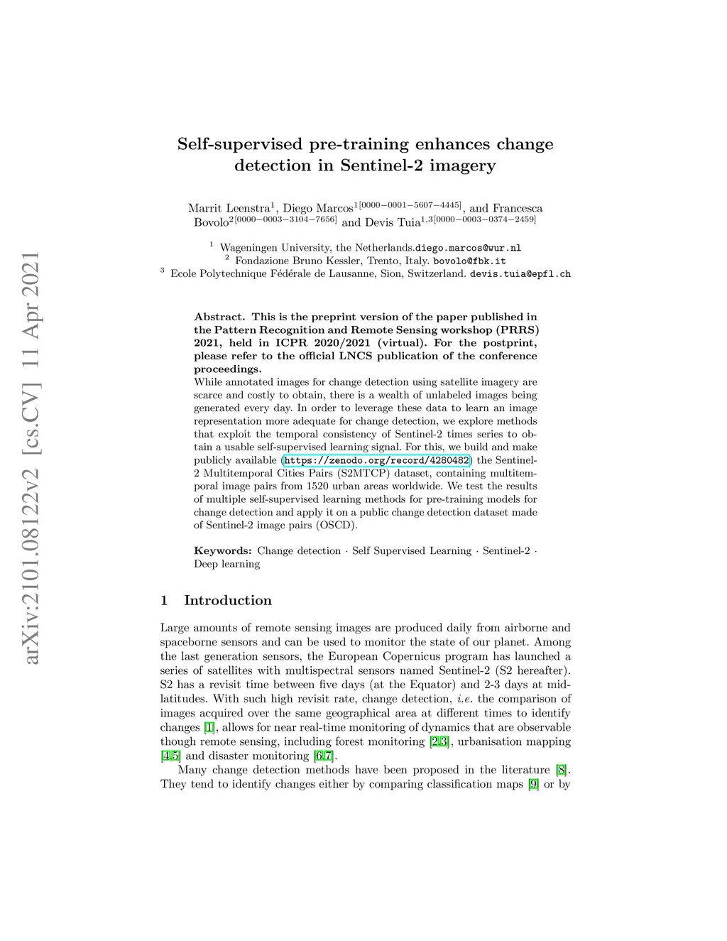 While annotated images for change detection using satellite imagery are scarce and costly to obtain, there is a wealth of unlabeled images being generated every day. In order to leverage these data to learn an image representation more adequate for change detection, we explore methods that exploit the temporal consistency of Sentinel-2 times series to obtain a usable self-supervised learning signal. For this, we build and make publicly available (https://zenodo.org/record/4280482) the Sentinel-2 Multitemporal Cities Pairs (S2MTCP) dataset, containing multitemporal image pairs from 1520 urban areas worldwide. We test the results of multiple self-supervised learning methods for pre-training models for change detection and apply it on a public change detection dataset made of Sentinel-2 image pairs (OSCD).
