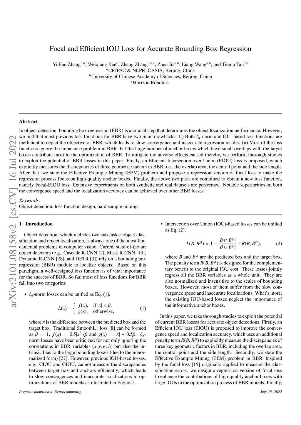 In object detection, bounding box regression (BBR) is a crucial step that determines the object localization performance. However, we find that most previous loss functions for BBR have two main drawbacks: (i) Both -norm and IOU-based loss functions are inefficient to depict the objective of BBR, which leads to slow convergence and inaccurate regression results. (ii) Most of the loss functions ignore the imbalance problem in BBR that the large number of anchor boxes which have small overlaps with the target boxes contribute most to the optimization of BBR. To mitigate the adverse effects caused thereby, we perform thorough studies to exploit the potential of BBR losses in this paper. Firstly, an Efficient Intersection over Union (EIOU) loss is proposed, which explicitly measures the discrepancies of three geometric factors in BBR, i.e., the overlap area, the central point and the side length. After that, we state the Effective Example Mining (EEM) problem and propose a regression version of focal loss to make the regression process focus on high-quality anchor boxes. Finally, the above two parts are combined to obtain a new loss function, namely Focal-EIOU loss. Extensive experiments on both synthetic and real datasets are performed. Notable superiorities on both the convergence speed and the localization accuracy can be achieved over other BBR losses.