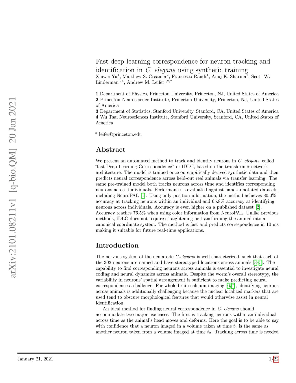 We present an automated method to track and identify neurons in C. elegans, called "fast Deep Learning Correspondence" or fDLC, based on the transformer network architecture. The model is trained once on empirically derived synthetic data and then predicts neural correspondence across held-out real animals via transfer learning. The same pre-trained model both tracks neurons across time and identifies corresponding neurons across individuals. Performance is evaluated against hand-annotated datasets, including NeuroPAL [1]. Using only position information, the method achieves 80.0% accuracy at tracking neurons within an individual and 65.8% accuracy at identifying neurons across individuals. Accuracy is even higher on a published dataset [2]. Accuracy reaches 76.5% when using color information from NeuroPAL. Unlike previous methods, fDLC does not require straightening or transforming the animal into a canonical coordinate system. The method is fast and predicts correspondence in 10 ms making it suitable for future real-time applications.