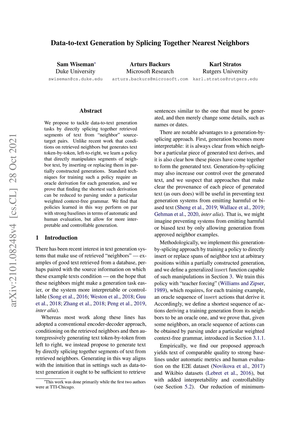 We propose to tackle data-to-text generation tasks by directly splicing together retrieved segments of text from "neighbor" source-target pairs. Unlike recent work that conditions on retrieved neighbors but generates text token-by-token, left-to-right, we learn a policy that directly manipulates segments of neighbor text, by inserting or replacing them in partially constructed generations. Standard techniques for training such a policy require an oracle derivation for each generation, and we prove that finding the shortest such derivation can be reduced to parsing under a particular weighted context-free grammar. We find that policies learned in this way perform on par with strong baselines in terms of automatic and human evaluation, but allow for more interpretable and controllable generation.