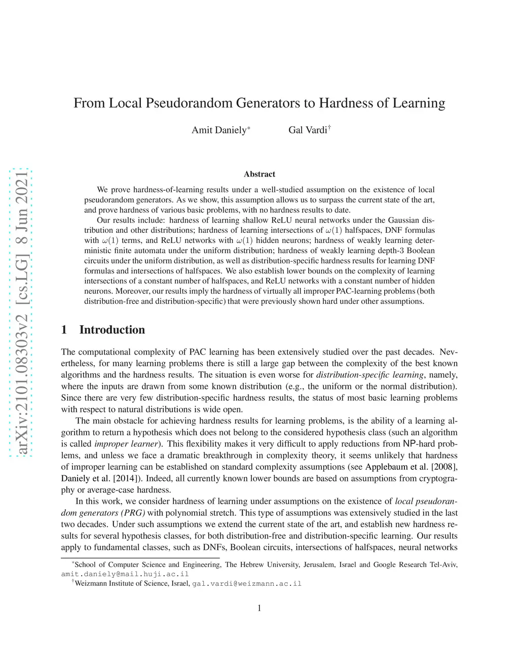 We prove hardness-of-learning results under a well-studied assumption on the existence of local pseudorandom generators. As we show, this assumption allows us to surpass the current state of the art, and prove hardness of various basic problems, with no hardness results to date. Our results include: hardness of learning shallow ReLU neural networks under the Gaussian distribution and other distributions; hardness of learning intersections of halfspaces, DNF formulas with terms, and ReLU networks with hidden neurons; hardness of weakly learning deterministic finite automata under the uniform distribution; hardness of weakly learning depth- Boolean circuits under the uniform distribution, as well as distribution-specific hardness results for learning DNF formulas and intersections of halfspaces. We also establish lower bounds on the complexity of learning intersections of a constant number of halfspaces, and ReLU networks with a constant number of hidden neurons. Moreover, our results imply the hardness of virtually all improper PAC-learning problems (both distribution-free and distribution-specific) that were previously shown hard under other assumptions.