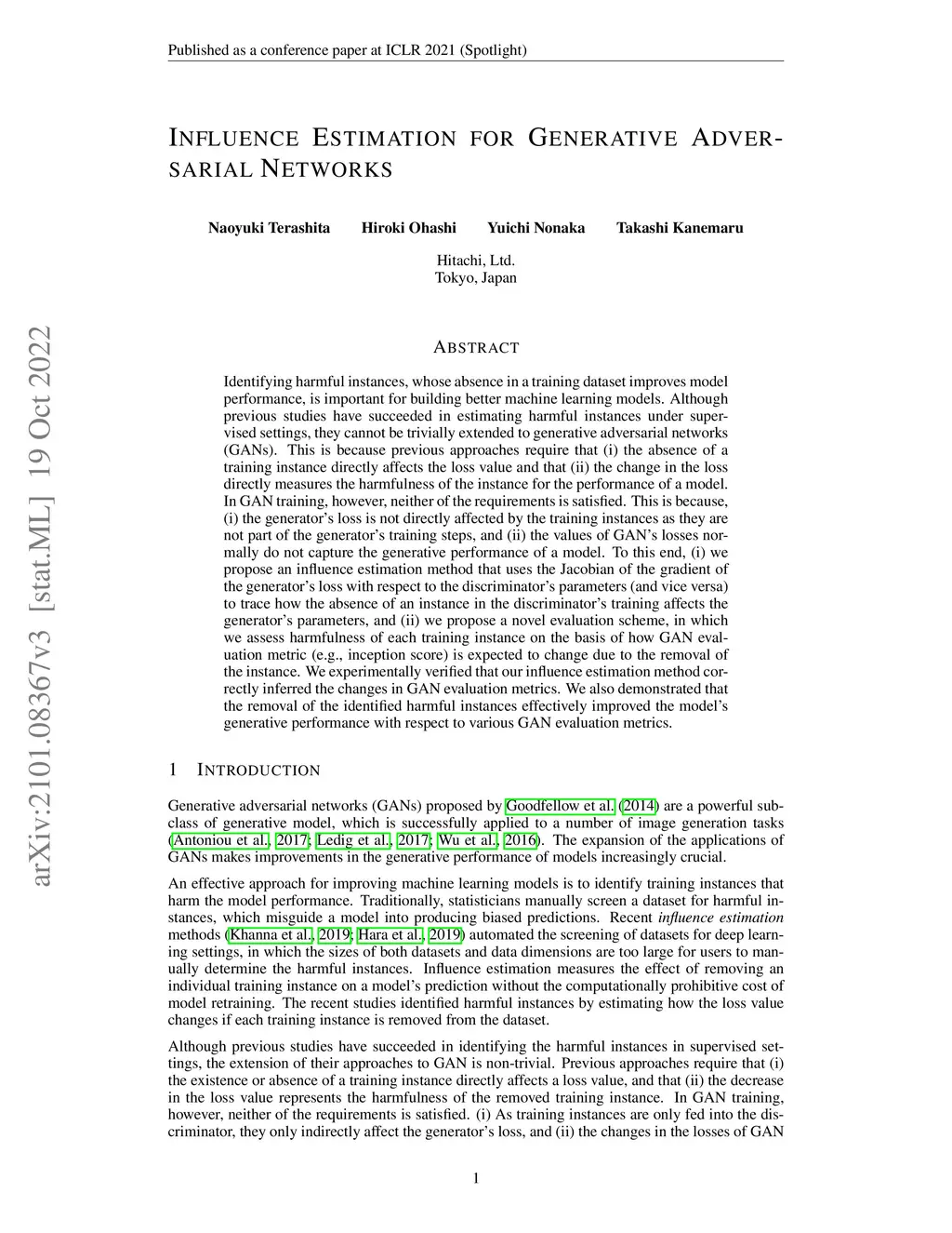 Identifying harmful instances, whose absence in a training dataset improves model performance, is important for building better machine learning models. Although previous studies have succeeded in estimating harmful instances under supervised settings, they cannot be trivially extended to generative adversarial networks (GANs). This is because previous approaches require that (1) the absence of a training instance directly affects the loss value and that (2) the change in the loss directly measures the harmfulness of the instance for the performance of a model. In GAN training, however, neither of the requirements is satisfied. This is because, (1) the generator's loss is not directly affected by the training instances as they are not part of the generator's training steps, and (2) the values of GAN's losses normally do not capture the generative performance of a model. To this end, (1) we propose an influence estimation method that uses the Jacobian of the gradient of the generator's loss with respect to the discriminator's parameters (and vice versa) to trace how the absence of an instance in the discriminator's training affects the generator's parameters, and (2) we propose a novel evaluation scheme, in which we assess harmfulness of each training instance on the basis of how GAN evaluation metric (e.g., inception score) is expect to change due to the removal of the instance. We experimentally verified that our influence estimation method correctly inferred the changes in GAN evaluation metrics. Further, we demonstrated that the removal of the identified harmful instances effectively improved the model's generative performance with respect to various GAN evaluation metrics.