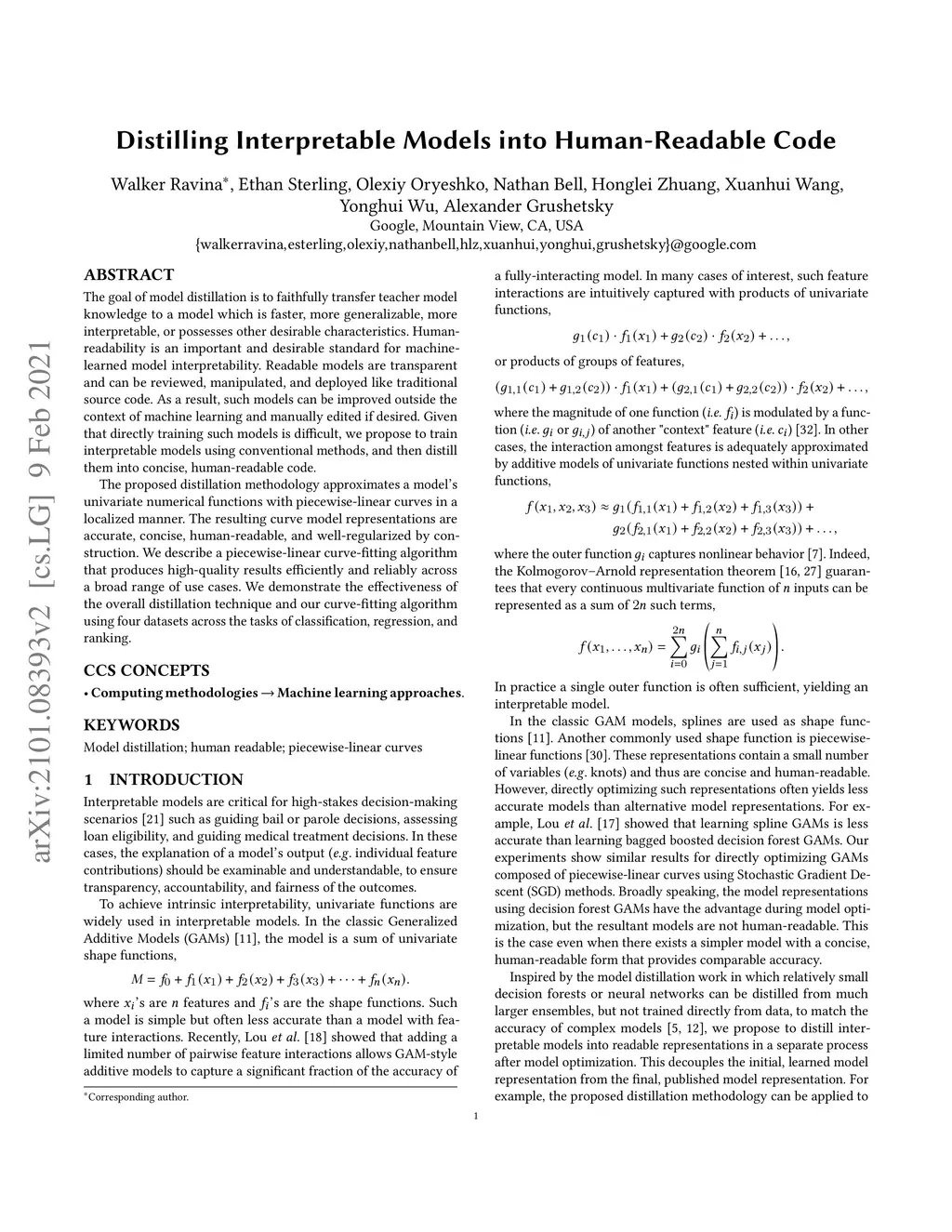 The goal of model distillation is to faithfully transfer teacher model knowledge to a model which is faster, more generalizable, more interpretable, or possesses other desirable characteristics. Human-readability is an important and desirable standard for machine-learned model interpretability. Readable models are transparent and can be reviewed, manipulated, and deployed like traditional source code. As a result, such models can be improved outside the context of machine learning and manually edited if desired. Given that directly training such models is difficult, we propose to train interpretable models using conventional methods, and then distill them into concise, human-readable code. The proposed distillation methodology approximates a model's univariate numerical functions with piecewise-linear curves in a localized manner. The resulting curve model representations are accurate, concise, human-readable, and well-regularized by construction. We describe a piecewise-linear curve-fitting algorithm that produces high-quality results efficiently and reliably across a broad range of use cases. We demonstrate the effectiveness of the overall distillation technique and our curve-fitting algorithm using three publicly available datasets COMPAS, FICO, and MSLR-WEB30K.