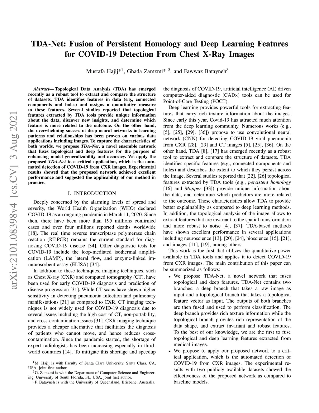 Topological Data Analysis (TDA) has emerged recently as a robust tool to extract and compare the structure of datasets. TDA identifies features in data such as connected components and holes and assigns a quantitative measure to these features. Several studies reported that topological features extracted by TDA tools provide unique information about the data, discover new insights, and determine which feature is more related to the outcome. On the other hand, the overwhelming success of deep neural networks in learning patterns and relationships has been proven on a vast array of data applications, images in particular. To capture the characteristics of both powerful tools, we propose \textit{TDA-Net}, a novel ensemble network that fuses topological and deep features for the purpose of enhancing model generalizability and accuracy. We apply the proposed \textit{TDA-Net} to a critical application, which is the automated detection of COVID-19 from CXR images. The experimental results showed that the proposed network achieved excellent performance and suggests the applicability of our method in practice.