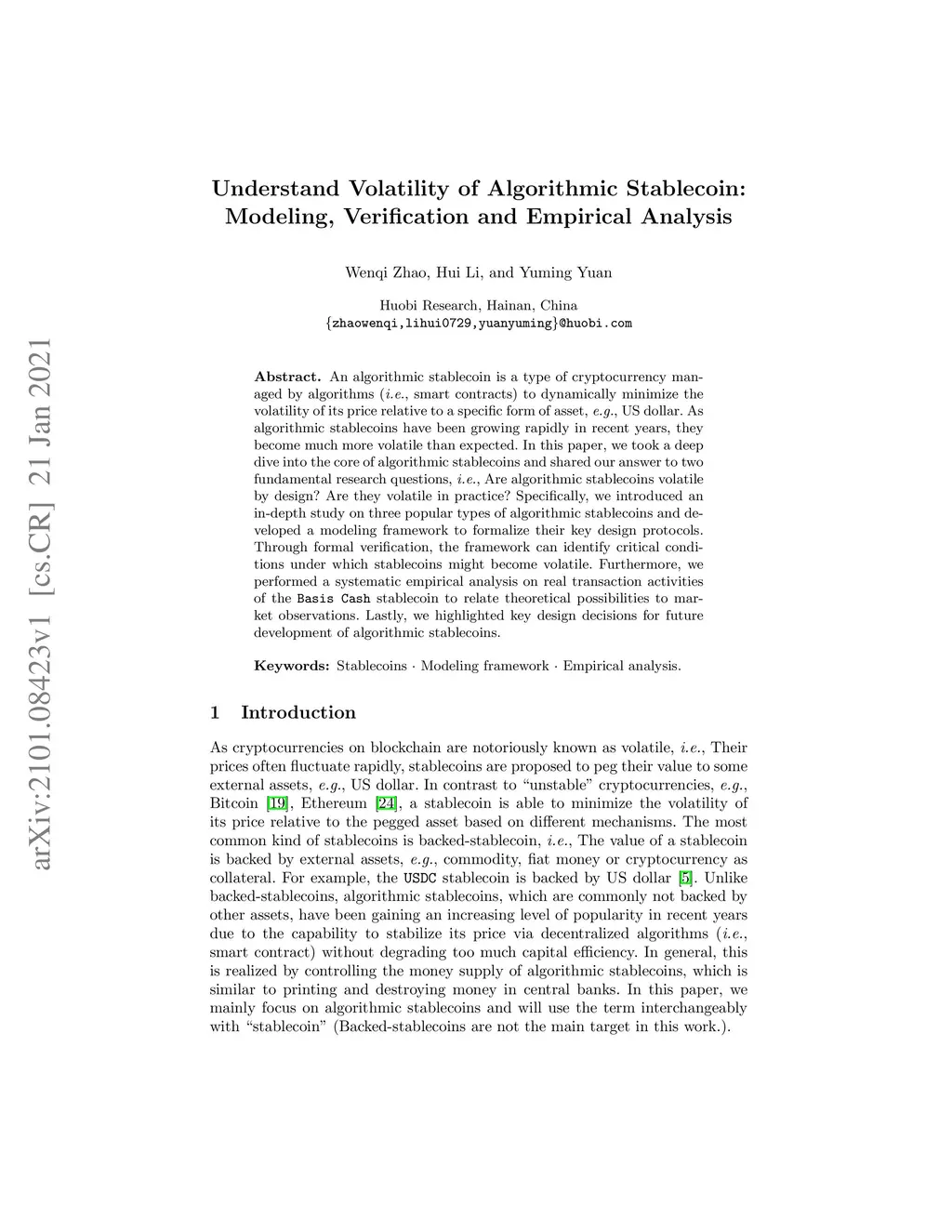 Understand Volatility of Algorithmic Stablecoin: Modeling, Verification