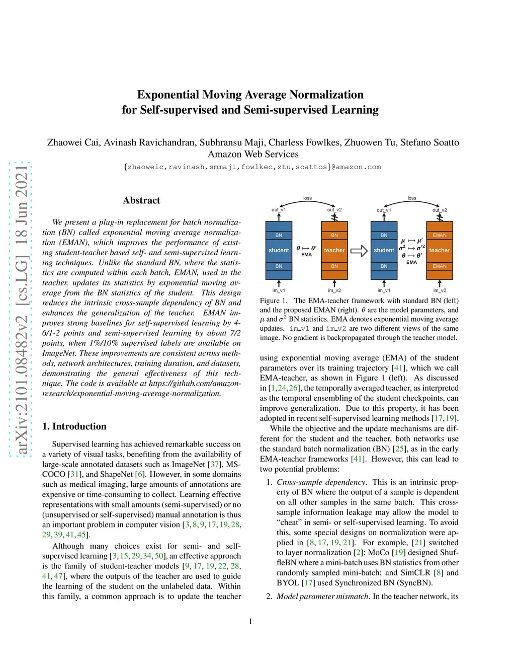 We present a plug-in replacement for batch normalization (BN) called exponential moving average normalization (EMAN), which improves the performance of existing student-teacher based self- and semi-supervised learning techniques. Unlike the standard BN, where the statistics are computed within each batch, EMAN, used in the teacher, updates its statistics by exponential moving average from the BN statistics of the student. This design reduces the intrinsic cross-sample dependency of BN and enhances the generalization of the teacher. EMAN improves strong baselines for self-supervised learning by 4-6/1-2 points and semi-supervised learning by about 7/2 points, when 1%/10% supervised labels are available on ImageNet. These improvements are consistent across methods, network architectures, training duration, and datasets, demonstrating the general effectiveness of this technique. The code is available at https://github.com/amazon-research/exponential-moving-average-normalization.