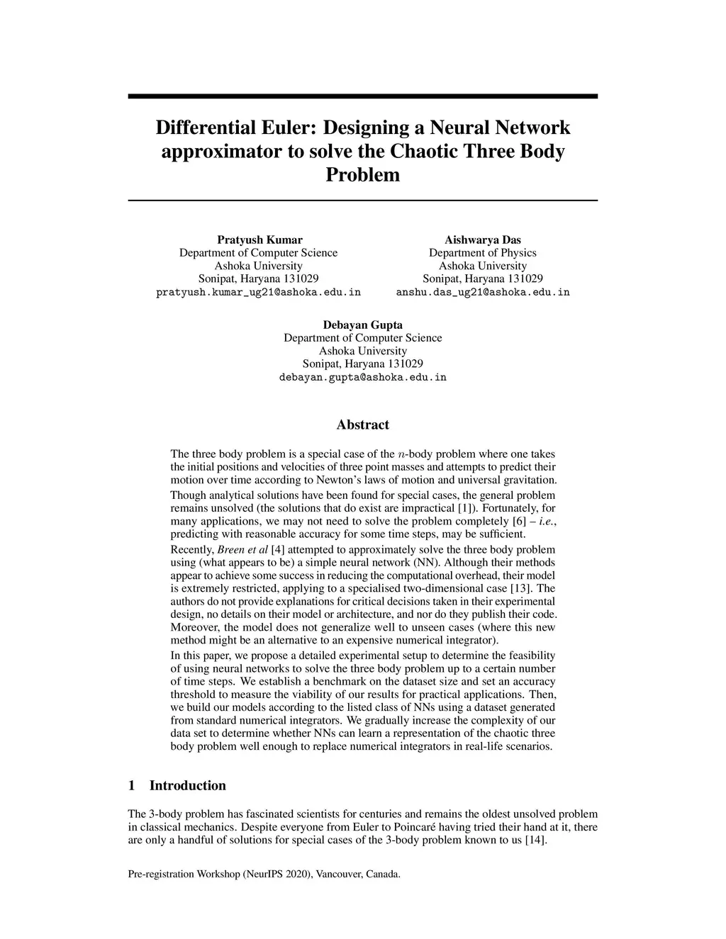 The three body problem is a special case of the n body problem where one takes the initial positions and velocities of three point masses and attempts to predict their motion over time according to Newtonian laws of motion and universal gravitation. Though analytical solutions have been found for special cases, the general problem remains unsolved; the solutions that do exist are impractical. Fortunately, for many applications, we may not need to solve the problem completely, i.e., predicting with reasonable accuracy for some time steps, may be sufficient. Recently, Breen et al attempted to approximately solve the three body problem using a simple neural network. Although their methods appear to achieve some success in reducing the computational overhead, their model is extremely restricted, applying to a specialized 2D case. The authors do not provide explanations for critical decisions taken in their experimental design, no details on their model or architecture, and nor do they publish their code. Moreover, the model does not generalize well to unseen cases. In this paper, we propose a detailed experimental setup to determine the feasibility of using neural networks to solve the three body problem up to a certain number of time steps. We establish a benchmark on the dataset size and set an accuracy threshold to measure the viability of our results for practical applications. Then, we build our models according to the listed class of NNs using a dataset generated from standard numerical integrators. We gradually increase the complexity of our data set to determine whether NNs can learn a representation of the chaotic three body problem well enough to replace numerical integrators in real life scenarios.