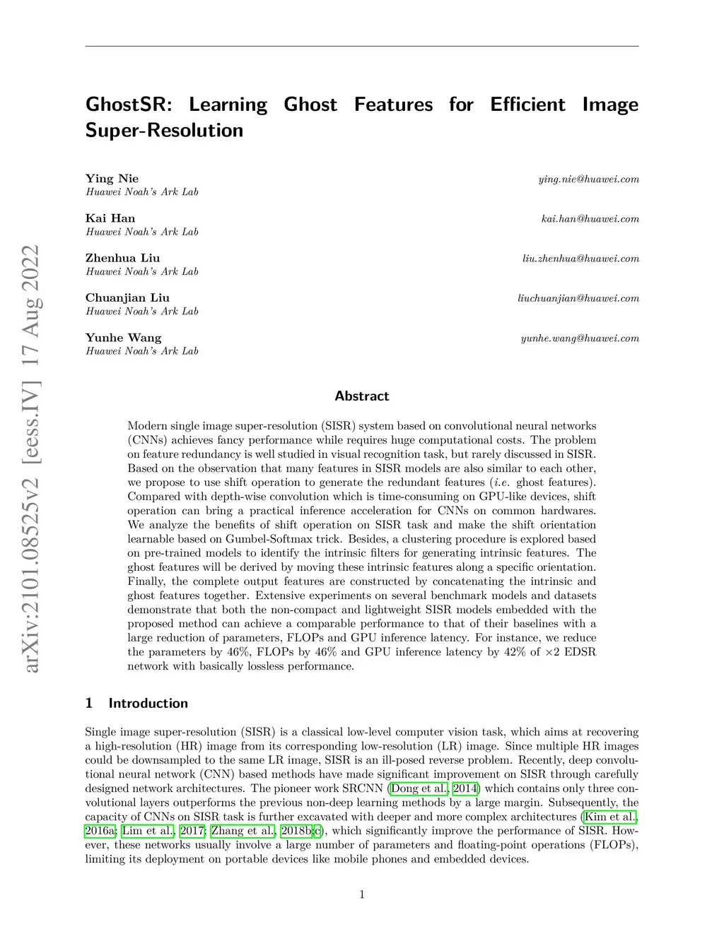 Modern single image super-resolution (SISR) system based on convolutional neural networks (CNNs) achieves fancy performance while requires huge computational costs. The problem on feature redundancy is well studied in visual recognition task, but rarely discussed in SISR. Based on the observation that many features in SISR models are also similar to each other, we propose to use shift operation to generate the redundant features (i.e., ghost features). Compared with depth-wise convolution which is time-consuming on GPU-like devices, shift operation can bring a practical inference acceleration for CNNs on common hardwares. We analyze the benefits of shift operation on SISR task and make the shift orientation learnable based on Gumbel-Softmax trick. Besides, a clustering procedure is explored based on pre-trained models to identify the intrinsic filters for generating intrinsic features. The ghost features will be derived by moving these intrinsic features along a specific orientation. Finally, the complete output features are constructed by concatenating the intrinsic and ghost features together. Extensive experiments on several benchmark models and datasets demonstrate that both the non-compact and lightweight SISR models embedded with the proposed method can achieve a comparable performance to that of their baselines with a large reduction of parameters, FLOPs and GPU inference latency. For instance, we reduce the parameters by 46%, FLOPs by 46% and GPU inference latency by 42% of EDSR network with basically lossless performance.