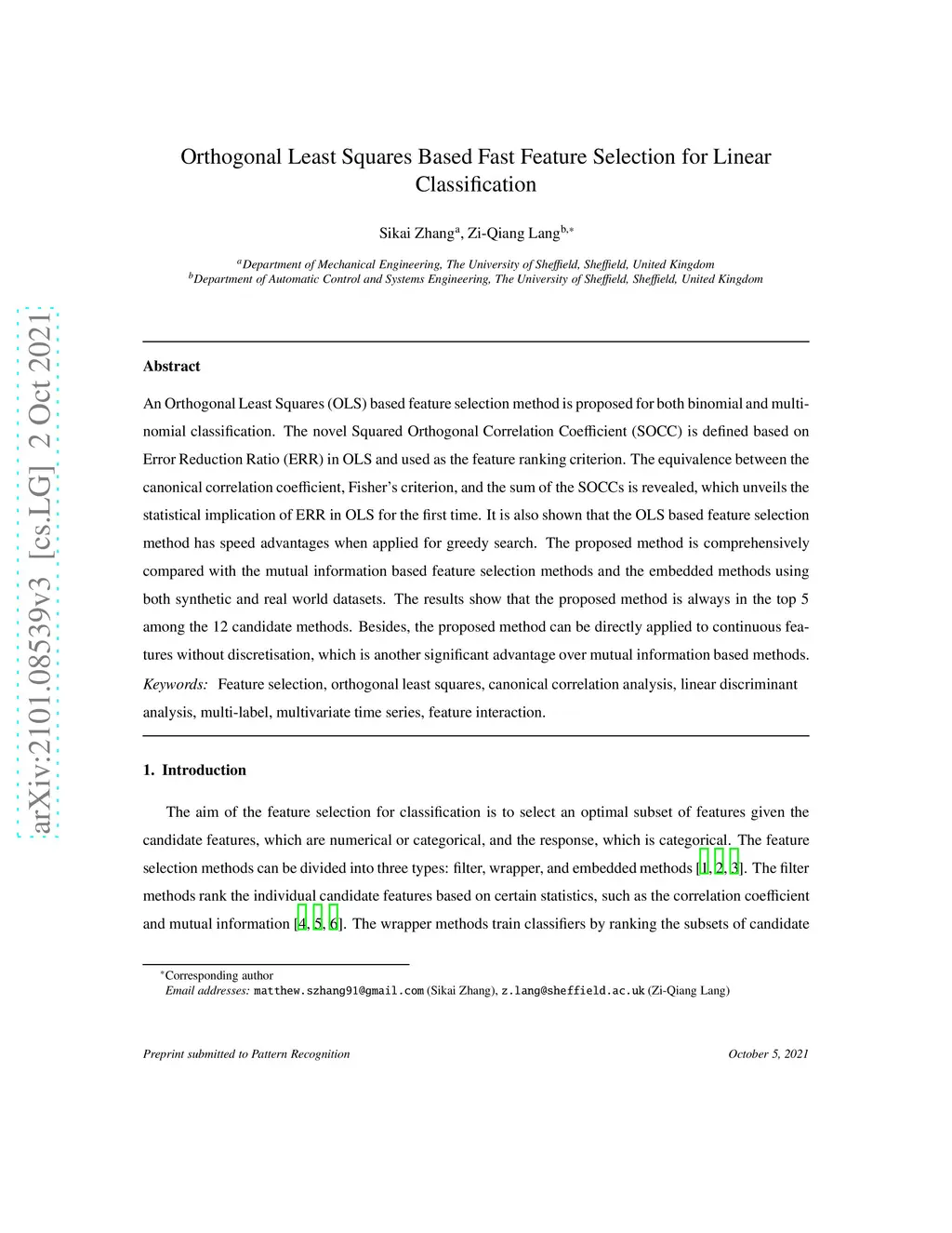 Orthogonal Least Squares Based Fast Feature Selection for Linear