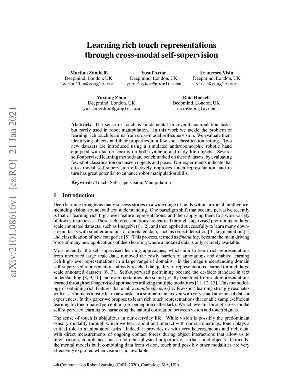 Learning rich touch representations through cross-modal self-supervision