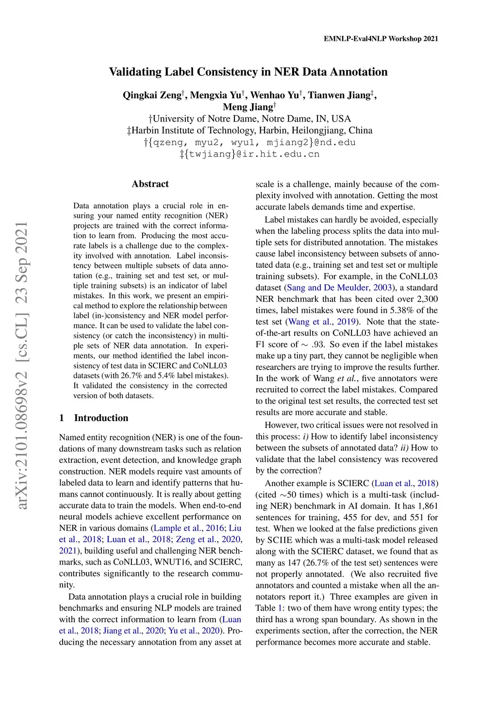 Data annotation plays a crucial role in ensuring your named entity recognition (NER) projects are trained with the right information to learn from. Producing the most accurate labels is a challenge due to the complexity involved with annotation. Label inconsistency between multiple subsets of data annotation (e.g., training set and test set, or multiple training subsets) is an indicator of label mistakes. In this work, we present an empirical method to explore the relationship between label (in-)consistency and NER model performance. It can be used to validate the label consistency (or catches the inconsistency) in multiple sets of NER data annotation. In experiments, our method identified the label inconsistency of test data in SCIERC and CoNLL03 datasets (with 26.7% and 5.4% label mistakes). It validated the consistency in the corrected version of both datasets.