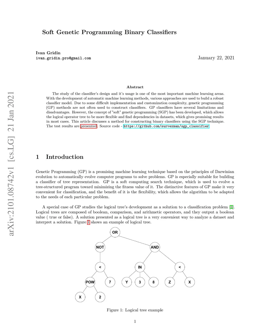 The study of the classifier's design and it's usage is one of the most important machine learning areas. With the development of automatic machine learning methods, various approaches are used to build a robust classifier model. Due to some difficult implementation and customization complexity, genetic programming (GP) methods are not often used to construct classifiers. GP classifiers have several limitations and disadvantages. However, the concept of "soft" genetic programming (SGP) has been developed, which allows the logical operator tree to be more flexible and find dependencies in datasets, which gives promising results in most cases. This article discusses a method for constructing binary classifiers using the SGP technique. The test results are presented. Source code - https://github.com/survexman/sgp_classifier.