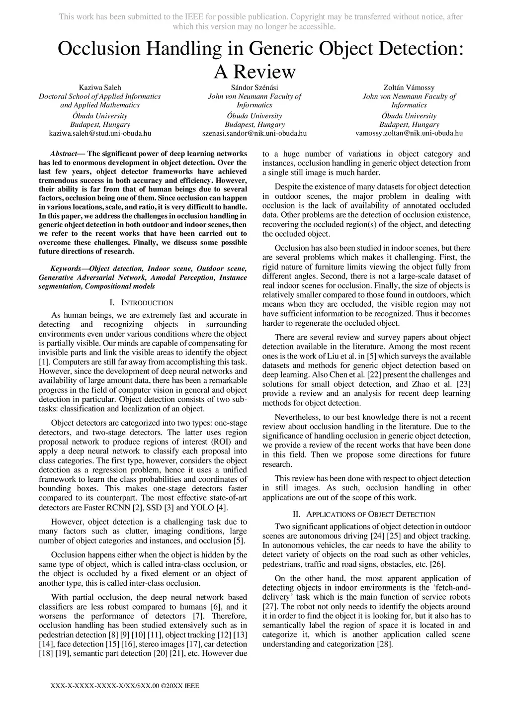 The significant power of deep learning networks has led to enormous development in object detection. Over the last few years, object detector frameworks have achieved tremendous success in both accuracy and efficiency. However, their ability is far from that of human beings due to several factors, occlusion being one of them. Since occlusion can happen in various locations, scale, and ratio, it is very difficult to handle. In this paper, we address the challenges in occlusion handling in generic object detection in both outdoor and indoor scenes, then we refer to the recent works that have been carried out to overcome these challenges. Finally, we discuss some possible future directions of research.