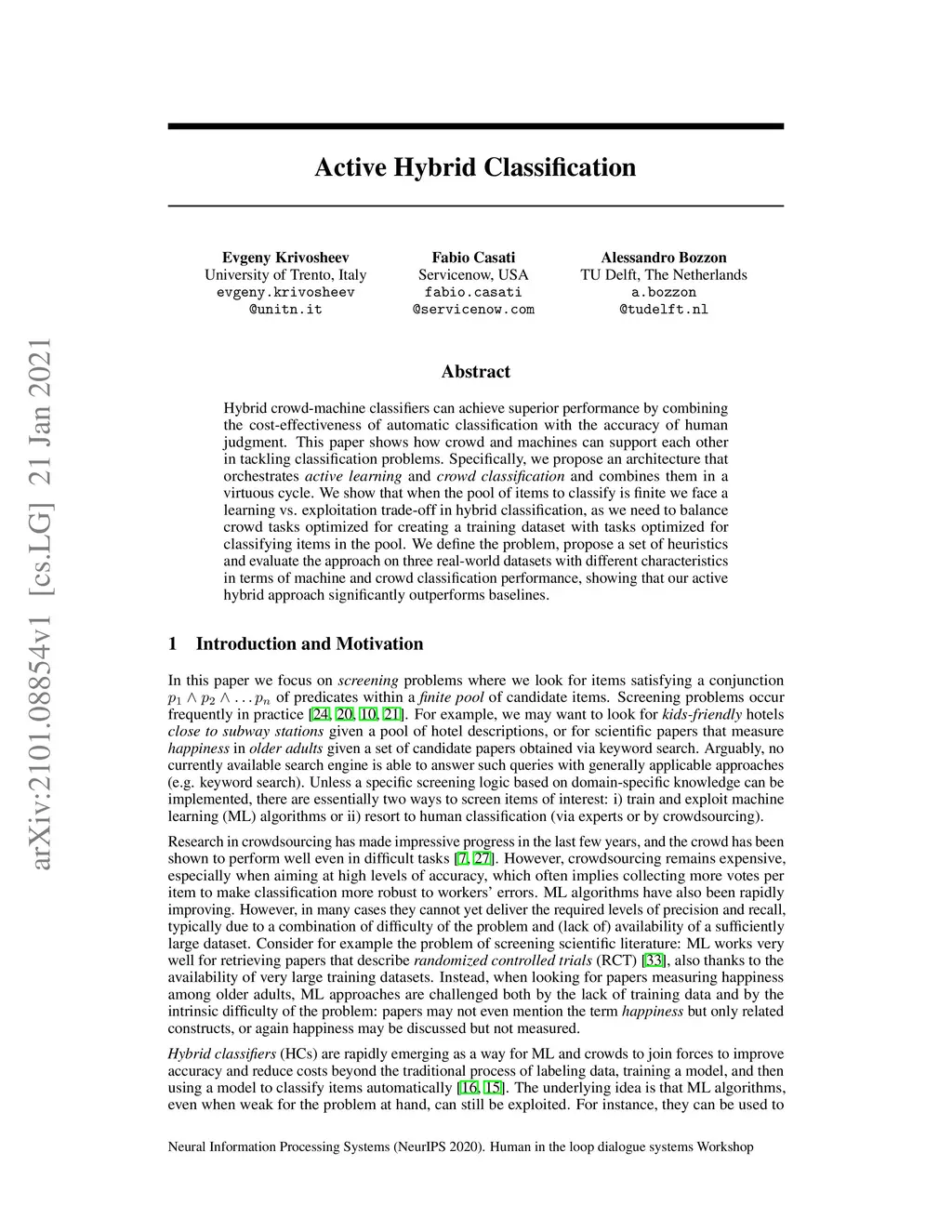 Hybrid crowd-machine classifiers can achieve superior performance by combining the cost-effectiveness of automatic classification with the accuracy of human judgment. This paper shows how crowd and machines can support each other in tackling classification problems. Specifically, we propose an architecture that orchestrates active learning and crowd classification and combines them in a virtuous cycle. We show that when the pool of items to classify is finite we face learning vs. exploitation trade-off in hybrid classification, as we need to balance crowd tasks optimized for creating a training dataset with tasks optimized for classifying items in the pool. We define the problem, propose a set of heuristics and evaluate the approach on three real-world datasets with different characteristics in terms of machine and crowd classification performance, showing that our active hybrid approach significantly outperforms baselines.