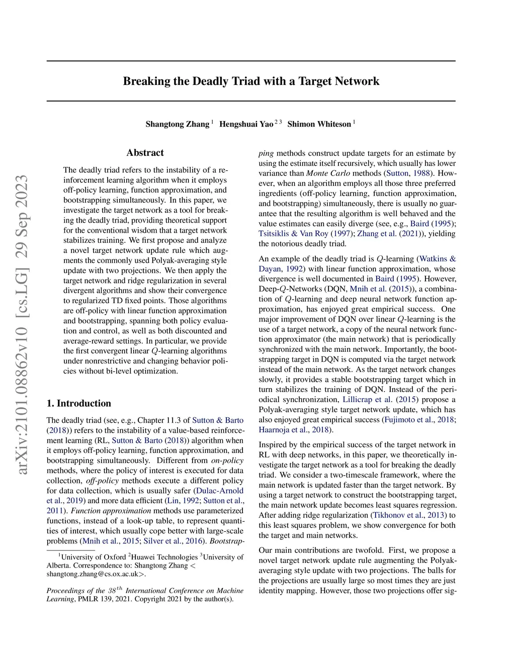 The deadly triad refers to the instability of a reinforcement learning algorithm when it employs off-policy learning, function approximation, and bootstrapping simultaneously. In this paper, we investigate the target network as a tool for breaking the deadly triad, providing theoretical support for the conventional wisdom that a target network stabilizes training. We first propose and analyze a novel target network update rule which augments the commonly used Polyak-averaging style update with two projections. We then apply the target network and ridge regularization in several divergent algorithms and show their convergence to regularized TD fixed points. Those algorithms are off-policy with linear function approximation and bootstrapping, spanning both policy evaluation and control, as well as both discounted and average-reward settings. In particular, we provide the first convergent linear -learning algorithms under nonrestrictive and changing behavior policies without bi-level optimization.