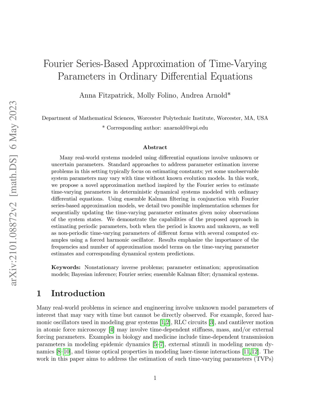 Many real-world systems modeled using differential equations involve unknown or uncertain parameters. Standard approaches to address parameter estimation inverse problems in this setting typically focus on estimating constants; yet some unobservable system parameters may vary with time without known evolution models. In this work, we propose a novel approximation method inspired by the Fourier series to estimate time-varying parameters in deterministic dynamical systems modeled with ordinary differential equations. Using ensemble Kalman filtering in conjunction with Fourier series-based approximation models, we detail two possible implementation schemes for sequentially updating the time-varying parameter estimates given noisy observations of the system states. We demonstrate the capabilities of the proposed approach in estimating periodic parameters, both when the period is known and unknown, as well as non-periodic time-varying parameters of different forms with several computed examples using a forced harmonic oscillator. Results emphasize the importance of the frequencies and number of approximation model terms on the time-varying parameter estimates and corresponding dynamical system predictions.