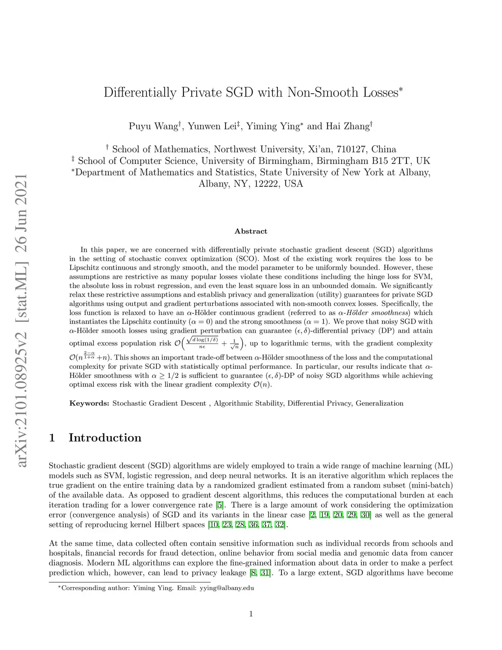 In this paper, we are concerned with differentially private SGD algorithms in the setting of stochastic convex optimization (SCO). Most of existing work requires the loss to be Lipschitz continuous and strongly smooth, and the model parameter to be uniformly bounded. However, these assumptions are restrictive as many popular losses violate these conditions including the hinge loss for SVM, the absolute loss in robust regression, and even the least square loss in an unbounded domain. We significantly relax these restrictive assumptions and establish privacy and generalization (utility) guarantees for private SGD algorithms using output and gradient perturbations associated with non-smooth convex losses. Specifically, the loss function is relaxed to have -H\"{o}lder continuous gradient (referred to as -H\"{o}lder smoothness) which instantiates the Lipschitz continuity () and strong smoothness (). We prove that noisy SGD with -H\"older smooth losses using gradient perturbation can guarantee -differential privacy (DP) and attain optimal excess population risk , up to logarithmic terms, with gradient complexity (i.e. the total number of iterations) This shows an important trade-off between -H\"older smoothness of the loss and the computational complexity for private SGD with statistically optimal performance. In particular, our results indicate that -H\"older smoothness with is sufficient to guarantee -DP of noisy SGD algorithms while achieving optimal excess risk with linear gradient complexity