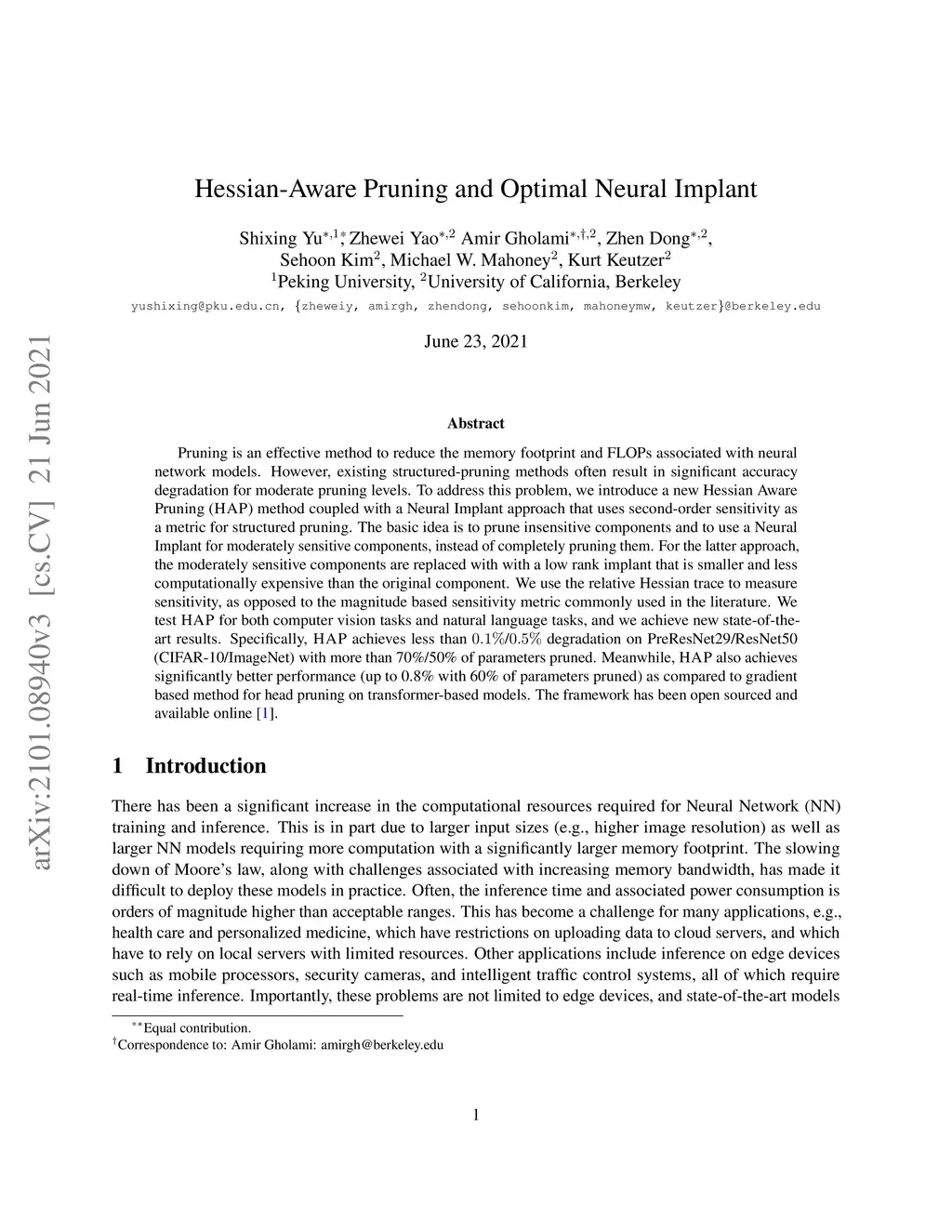 Pruning is an effective method to reduce the memory footprint and FLOPs associated with neural network models. However, existing structured-pruning methods often result in significant accuracy degradation for moderate pruning levels. To address this problem, we introduce a new Hessian Aware Pruning (HAP) method coupled with a Neural Implant approach that uses second-order sensitivity as a metric for structured pruning. The basic idea is to prune insensitive components and to use a Neural Implant for moderately sensitive components, instead of completely pruning them. For the latter approach, the moderately sensitive components are replaced with with a low rank implant that is smaller and less computationally expensive than the original component. We use the relative Hessian trace to measure sensitivity, as opposed to the magnitude based sensitivity metric commonly used in the literature. We test HAP for both computer vision tasks and natural language tasks, and we achieve new state-of-the-art results. Specifically, HAP achieves less than / degradation on PreResNet29/ResNet50 (CIFAR-10/ImageNet) with more than 70\%/50\% of parameters pruned. Meanwhile, HAP also achieves significantly better performance (up to 0.8\% with 60\% of parameters pruned) as compared to gradient based method for head pruning on transformer-based models. The framework has been open sourced and available online.