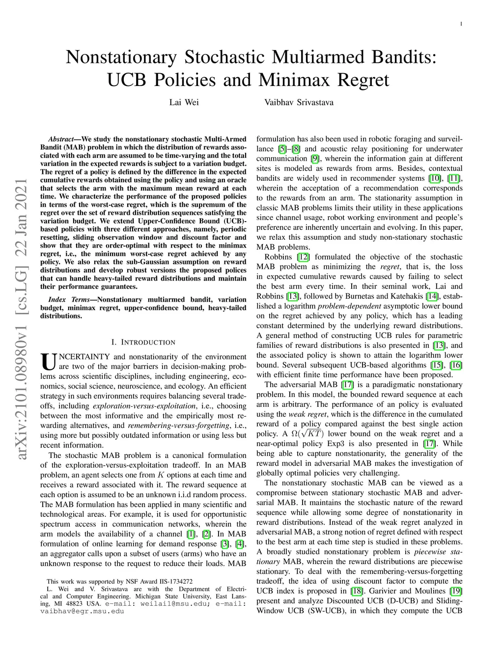 Nonstationary Stochastic Multiarmed Bandits: UCB Policies and Minimax