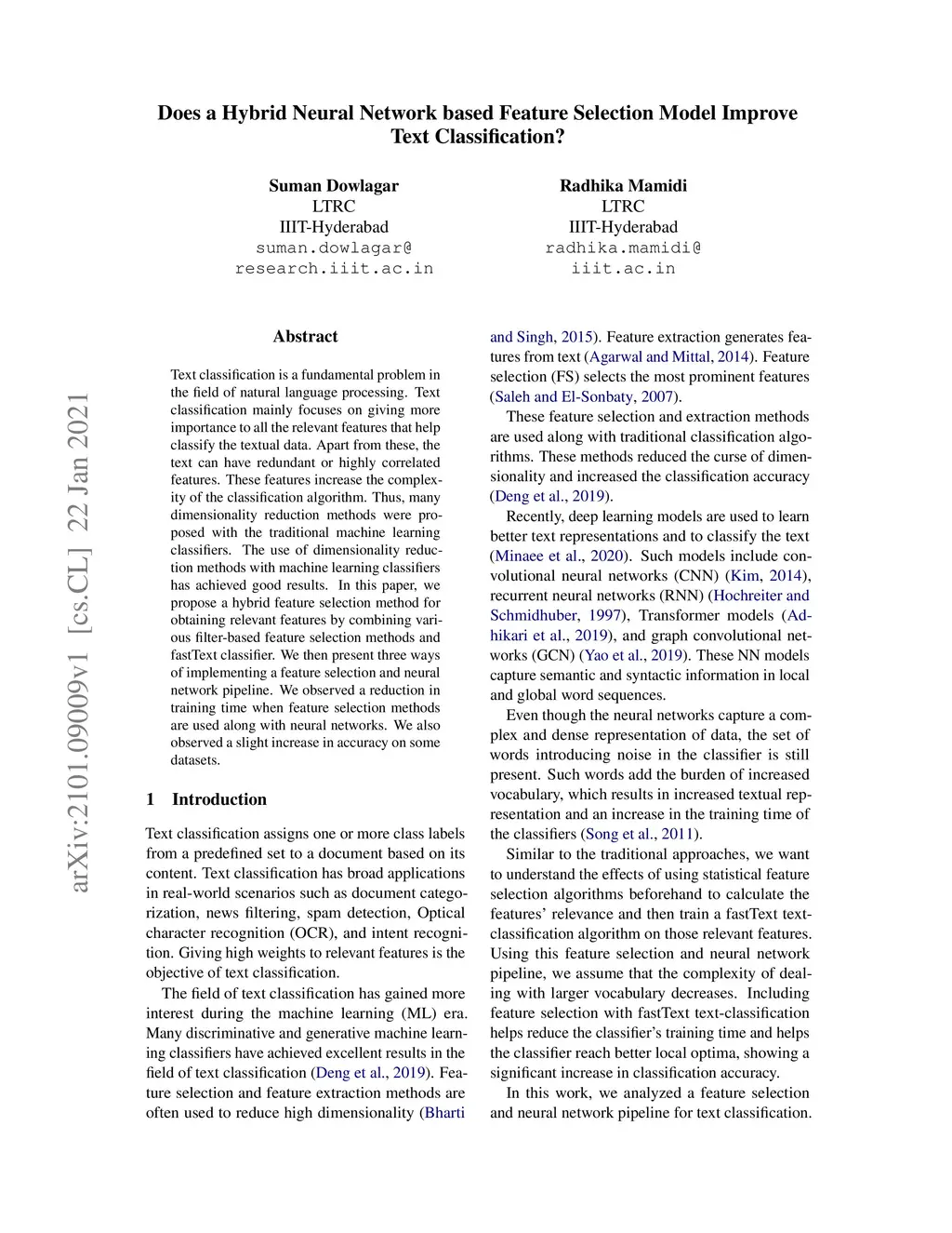 Does a Hybrid Neural Network based Feature Selection Model Improve Text