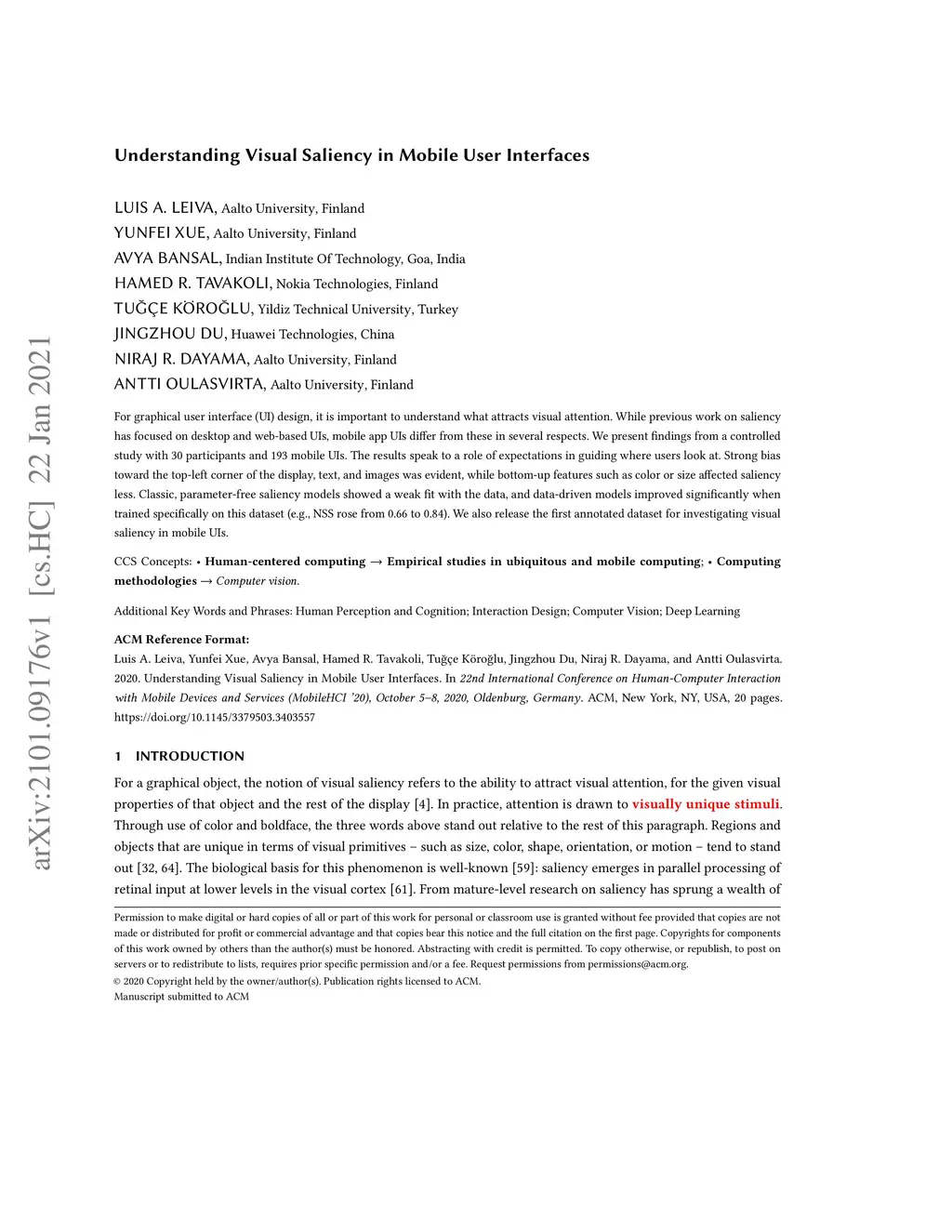 For graphical user interface (UI) design, it is important to understand what attracts visual attention. While previous work on saliency has focused on desktop and web-based UIs, mobile app UIs differ from these in several respects. We present findings from a controlled study with 30 participants and 193 mobile UIs. The results speak to a role of expectations in guiding where users look at. Strong bias toward the top-left corner of the display, text, and images was evident, while bottom-up features such as color or size affected saliency less. Classic, parameter-free saliency models showed a weak fit with the data, and data-driven models improved significantly when trained specifically on this dataset (e.g., NSS rose from 0.66 to 0.84). We also release the first annotated dataset for investigating visual saliency in mobile UIs.
